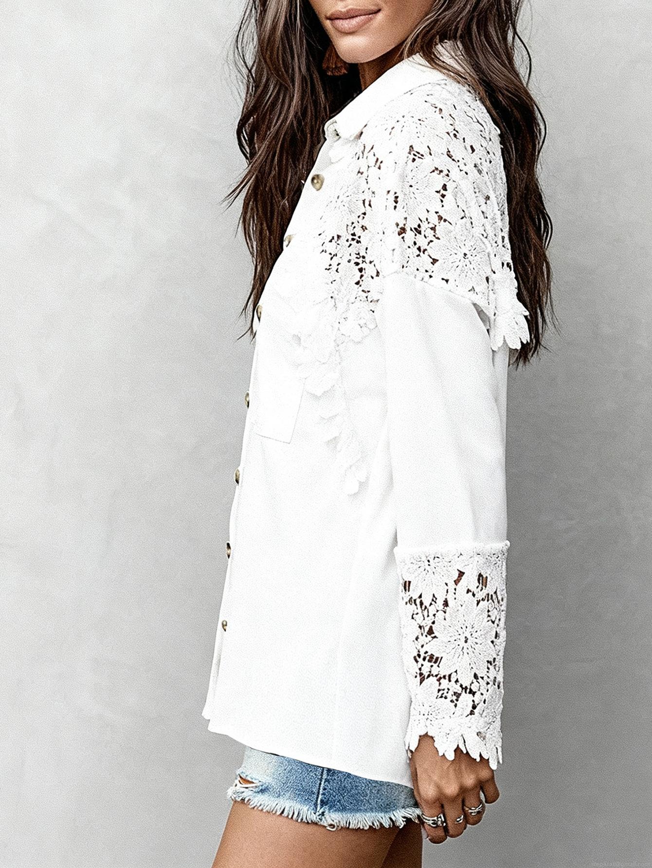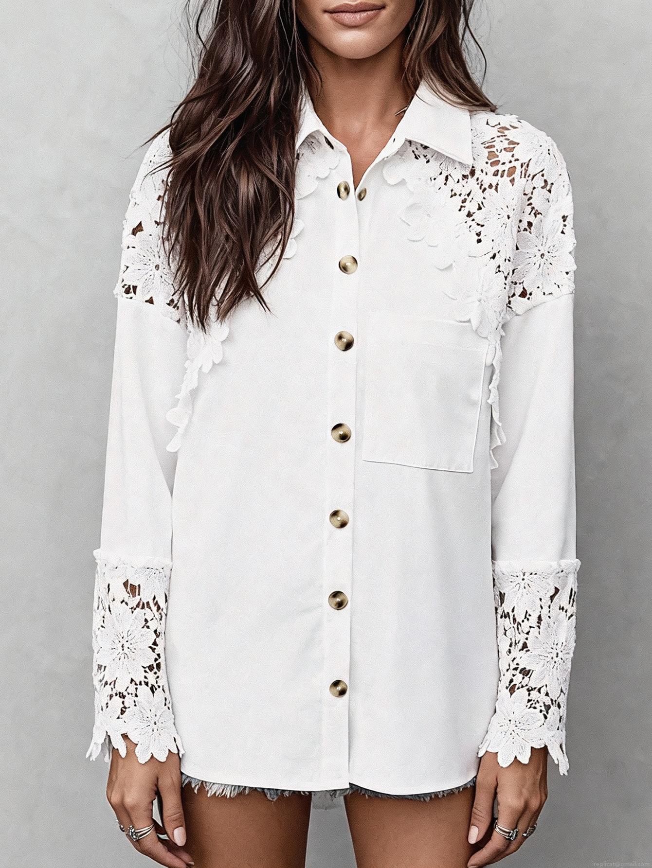 • Women Elegant Lace Patchwork Long Sleeve Shirt Turn-down Collar Button Down Blouse Hollow Out Office Commute Polyester Solid Color Tops