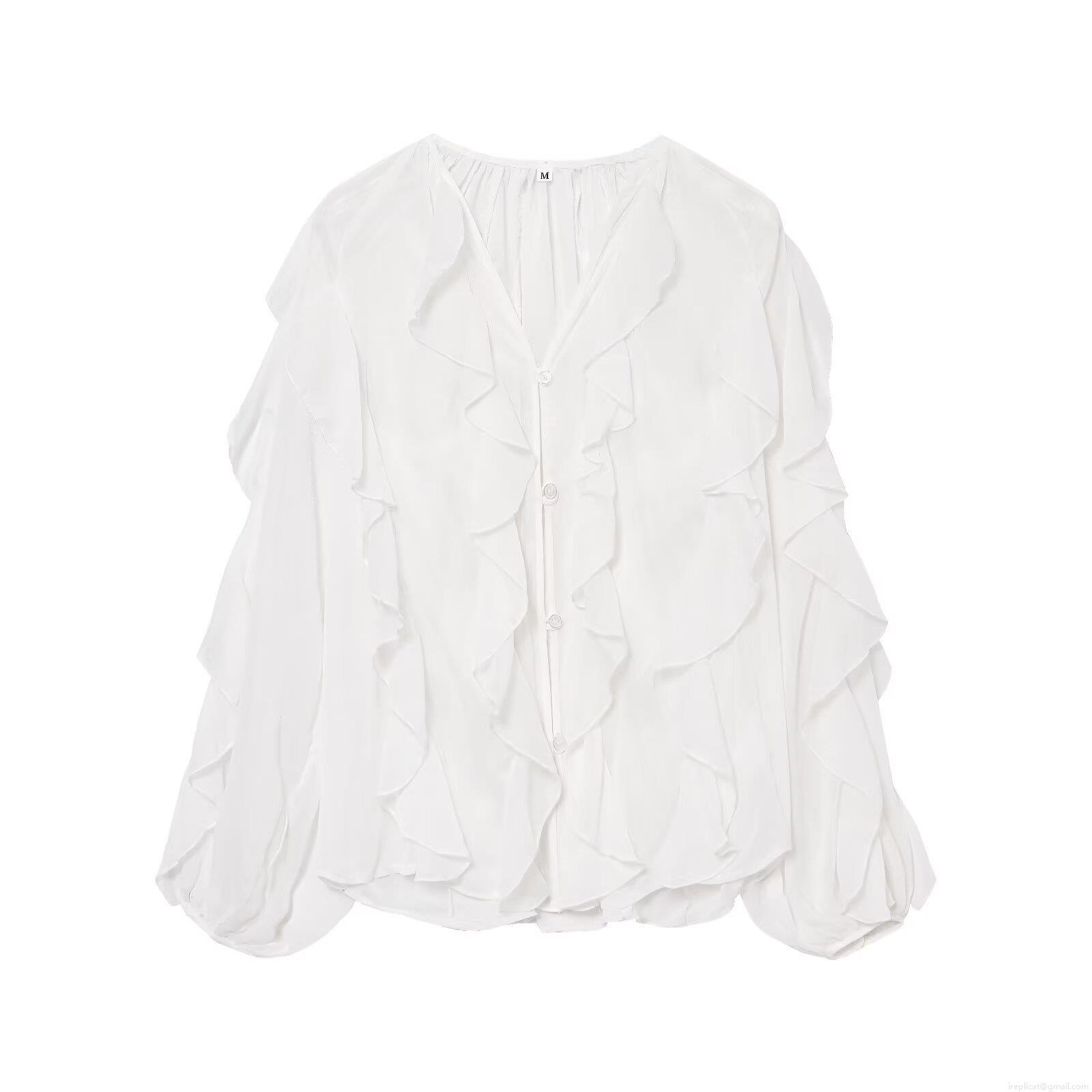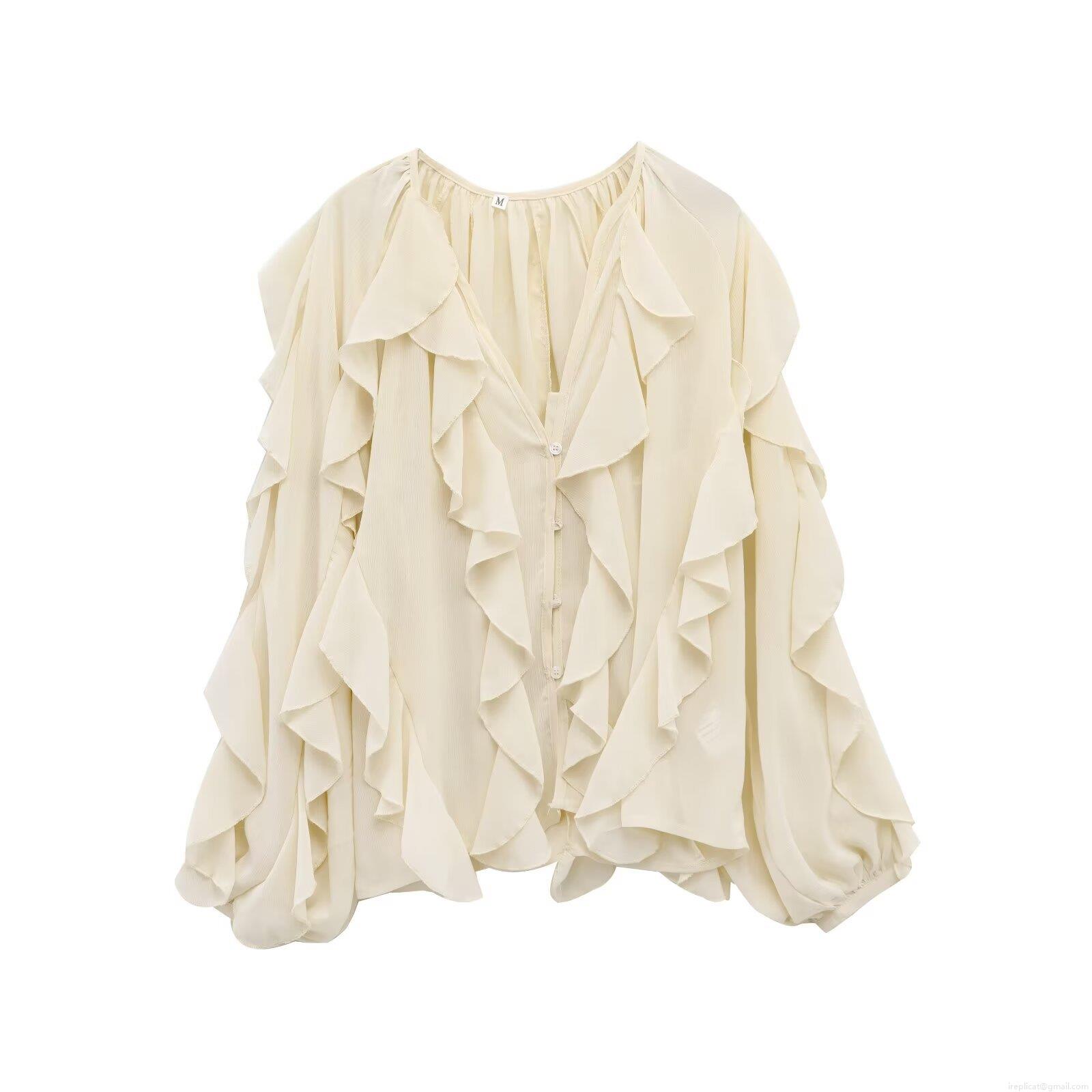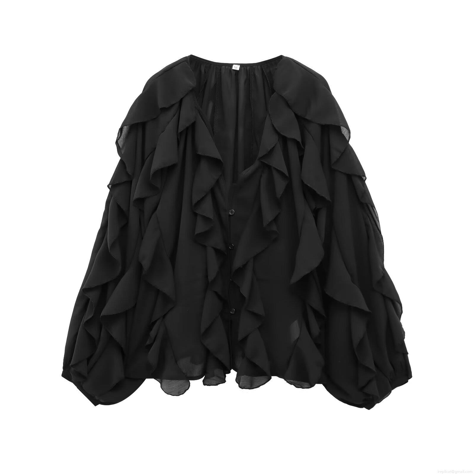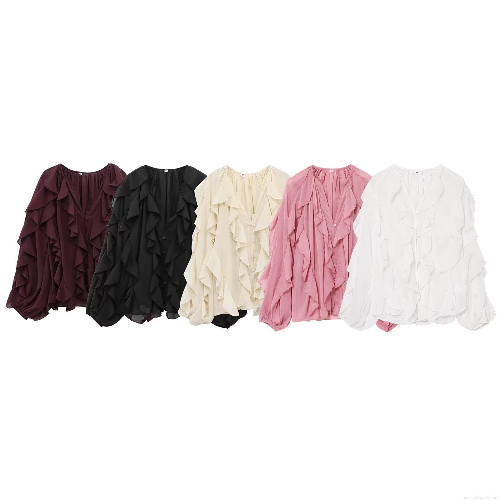 • Women Elegant Layered Ruffle Chiffon Blouse V-Neck Long Sleeve Solid Color Button Up Shirt For Office Party Dating Lady Fashion Tops