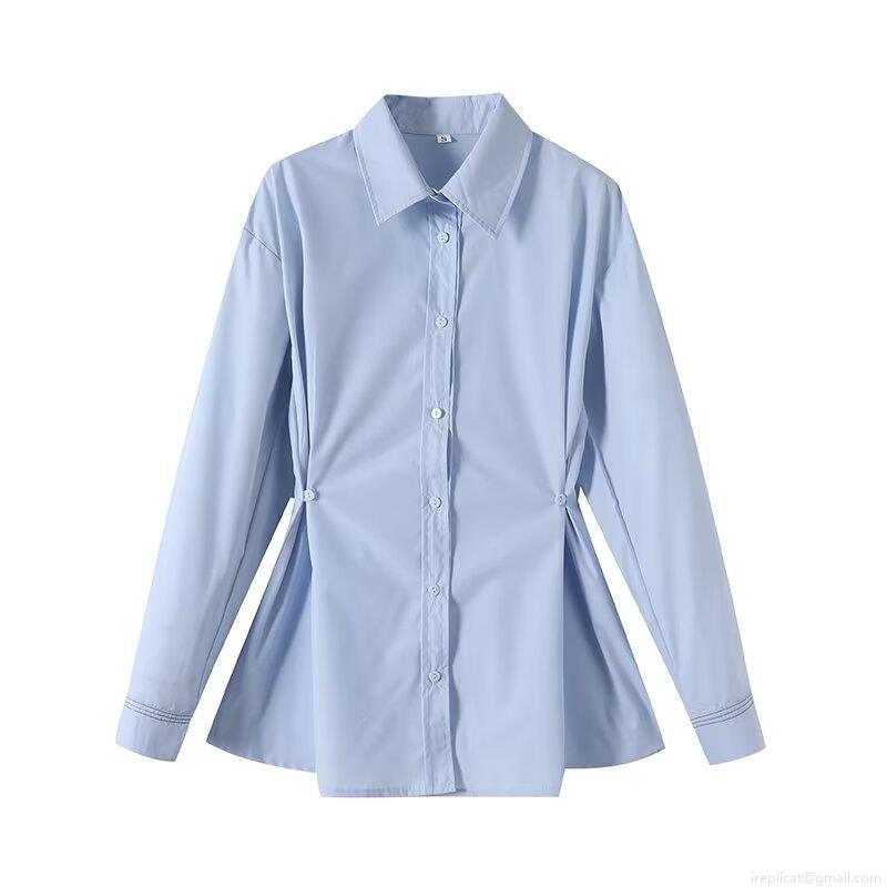 • Women Elegant Light Blue Long Sleeve Button Down Shirt Pleated Slim Fit Blouse 2025 Summer Western Style Office Commute Casual Tops