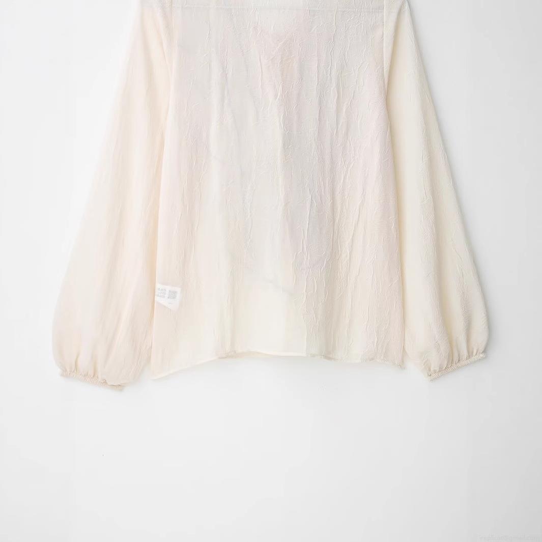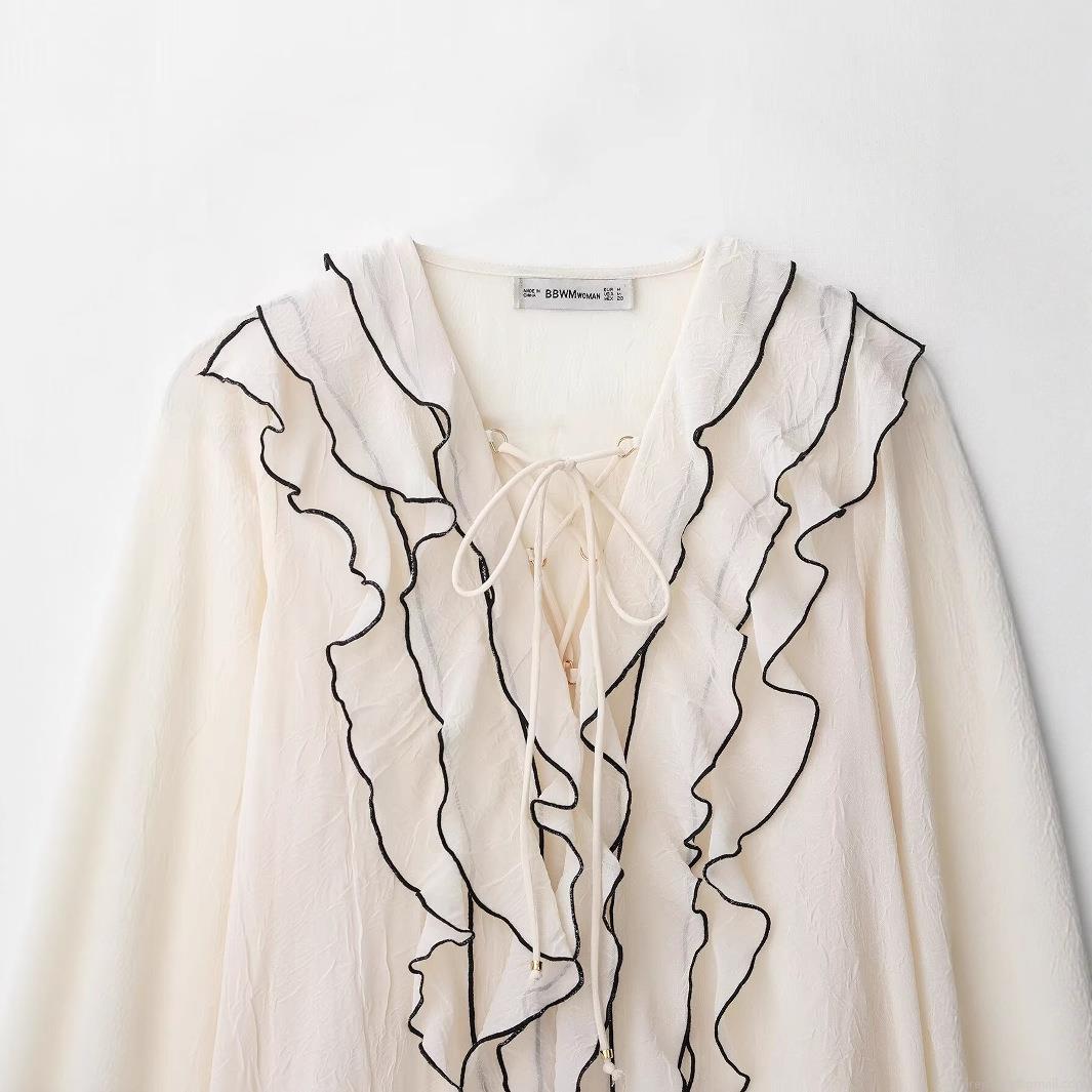 • Women Elegant Long Sleeve Blouse 100% Polyester Crinkled Texture Ruffle Trim V Neck Tie Front Shirt Contrast Piping Chic Top for Lady Daily Casual Wear