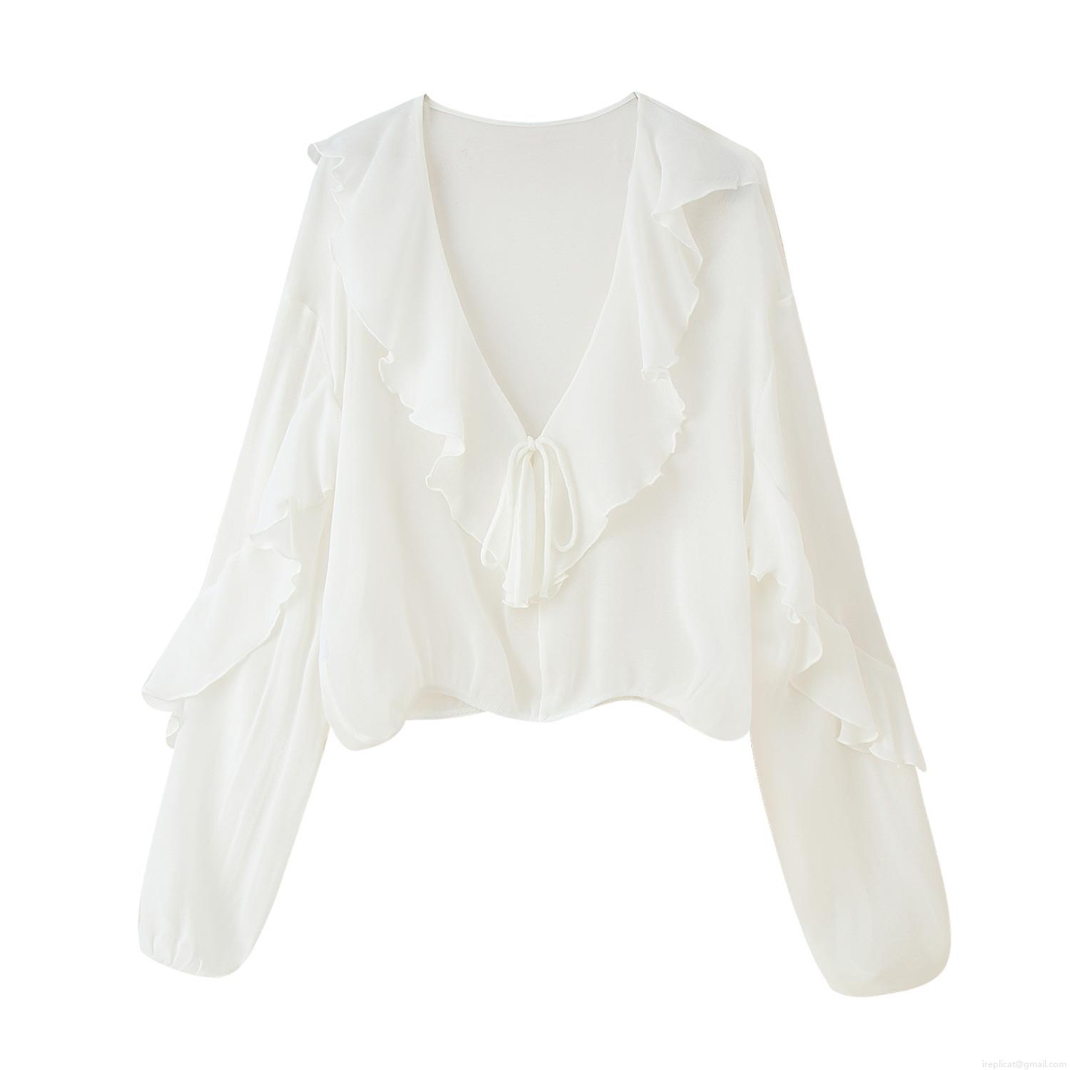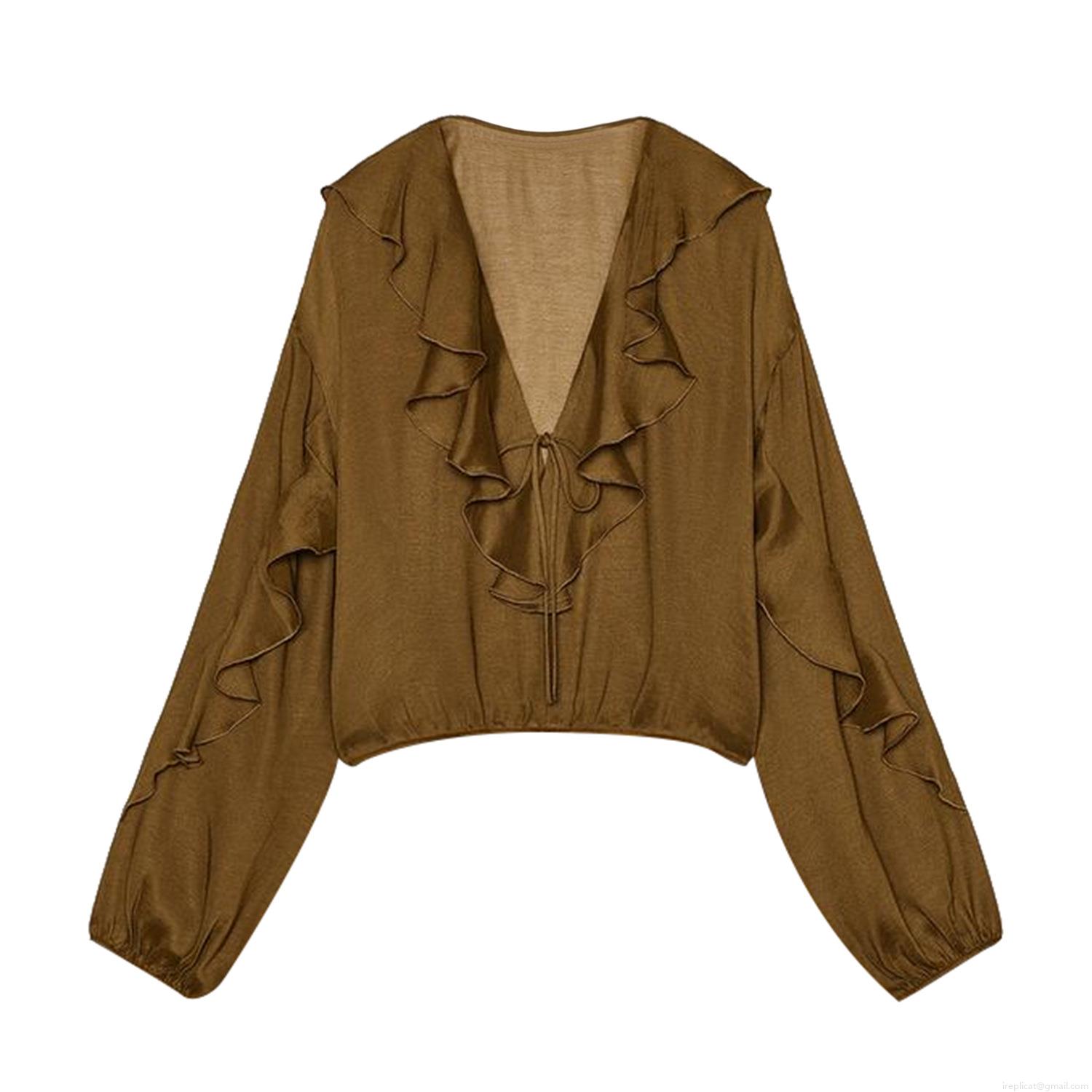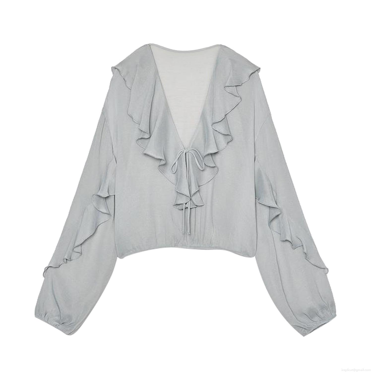 • Women Elegant Mesh Blouse Long Sleeve Deep V Neck Ruffle Trim Front Tie Shirt Lantern Sleeve Solid Color Sweet Casual Top Fashion Apparel