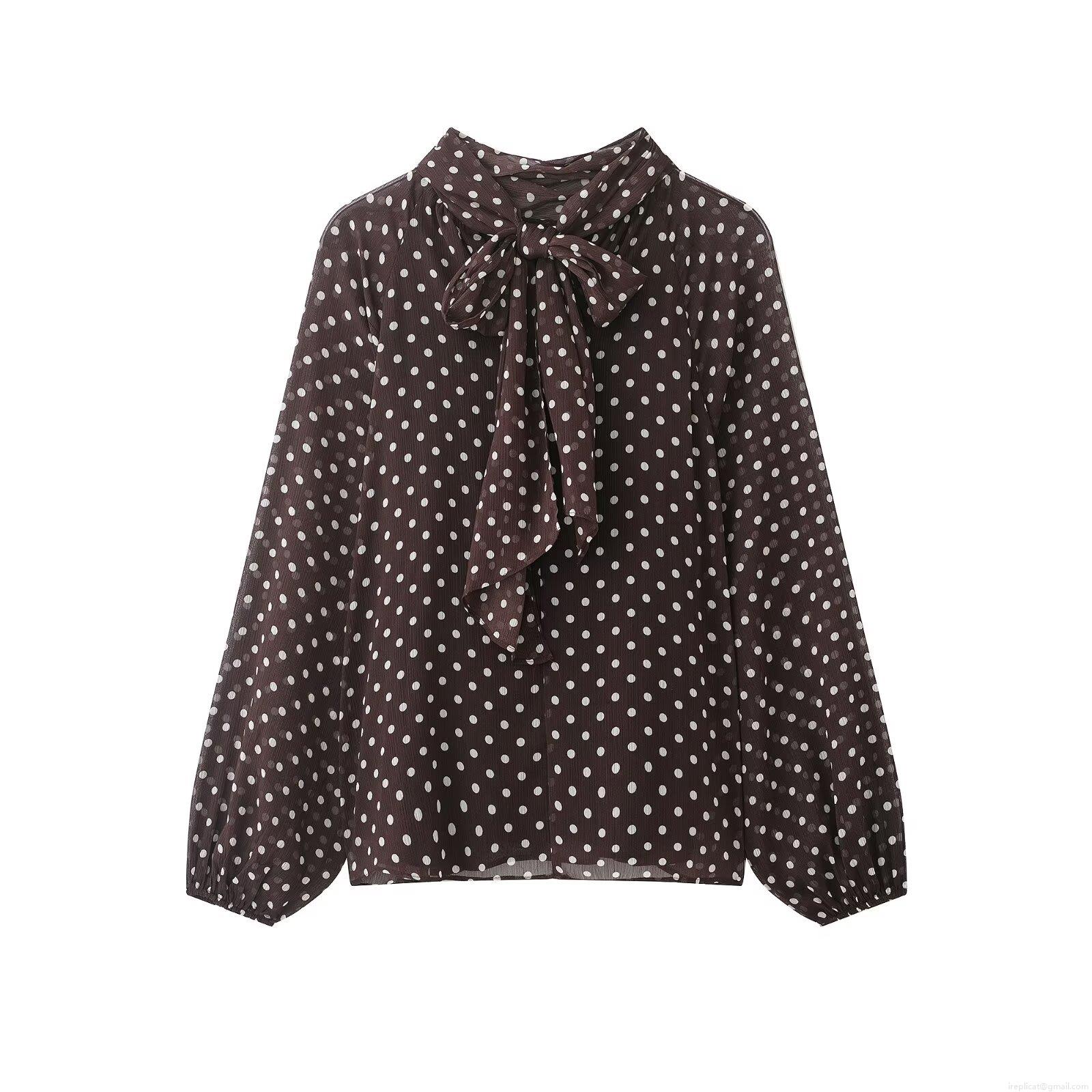 Women Elegant Polka Dot Chiffon Blouse With Bow Tie Neck Lantern Long Sleeve Casual Pullover Shirt For Women Fashion Ladies Tops
