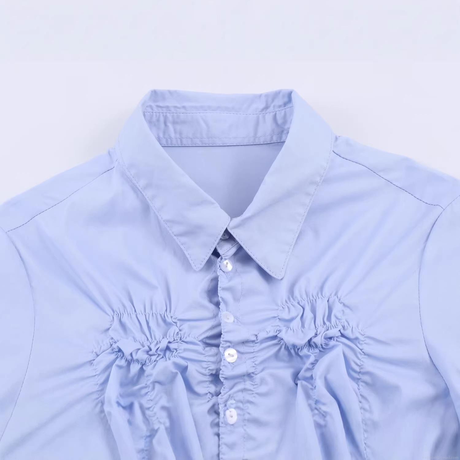 Women Elegant Ruched Front Poplin Shirt Solid Color Long Sleeve Button Up Blouse Slim Fit Office Lady Work Tops Sky Blue