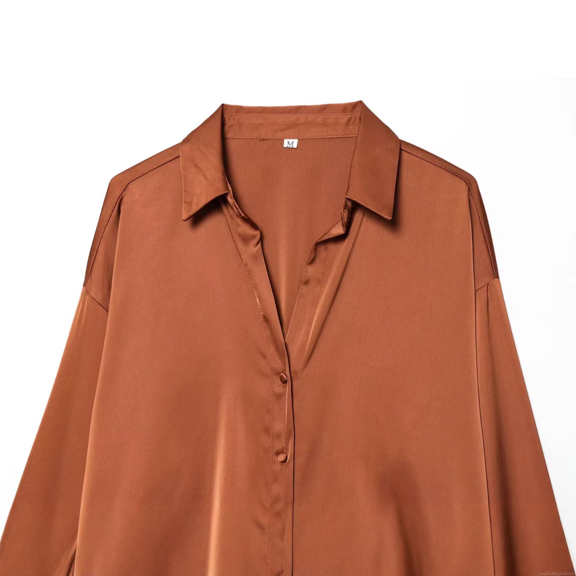 • Women Elegant Satin Shirt With Feather Cuffs Lapel Single Breasted Long Sleeve Blouse Caramel Solid Color Streetwear Top Autumn Fashion Clothing