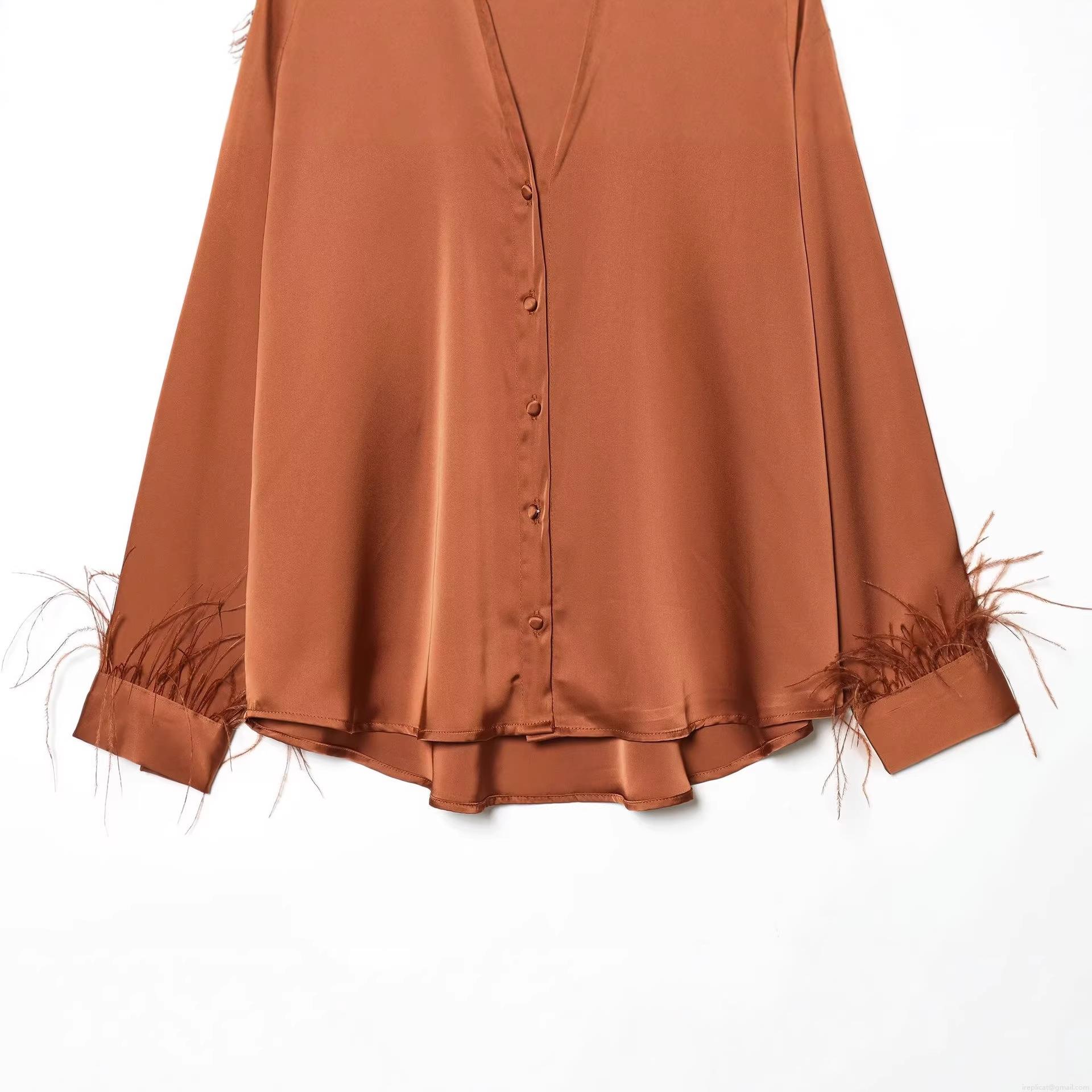 Women Elegant Satin Shirt With Feather Cuffs Lapel Single Breasted Long Sleeve Blouse Caramel Solid Color Streetwear Top Autumn Fashion Clothing