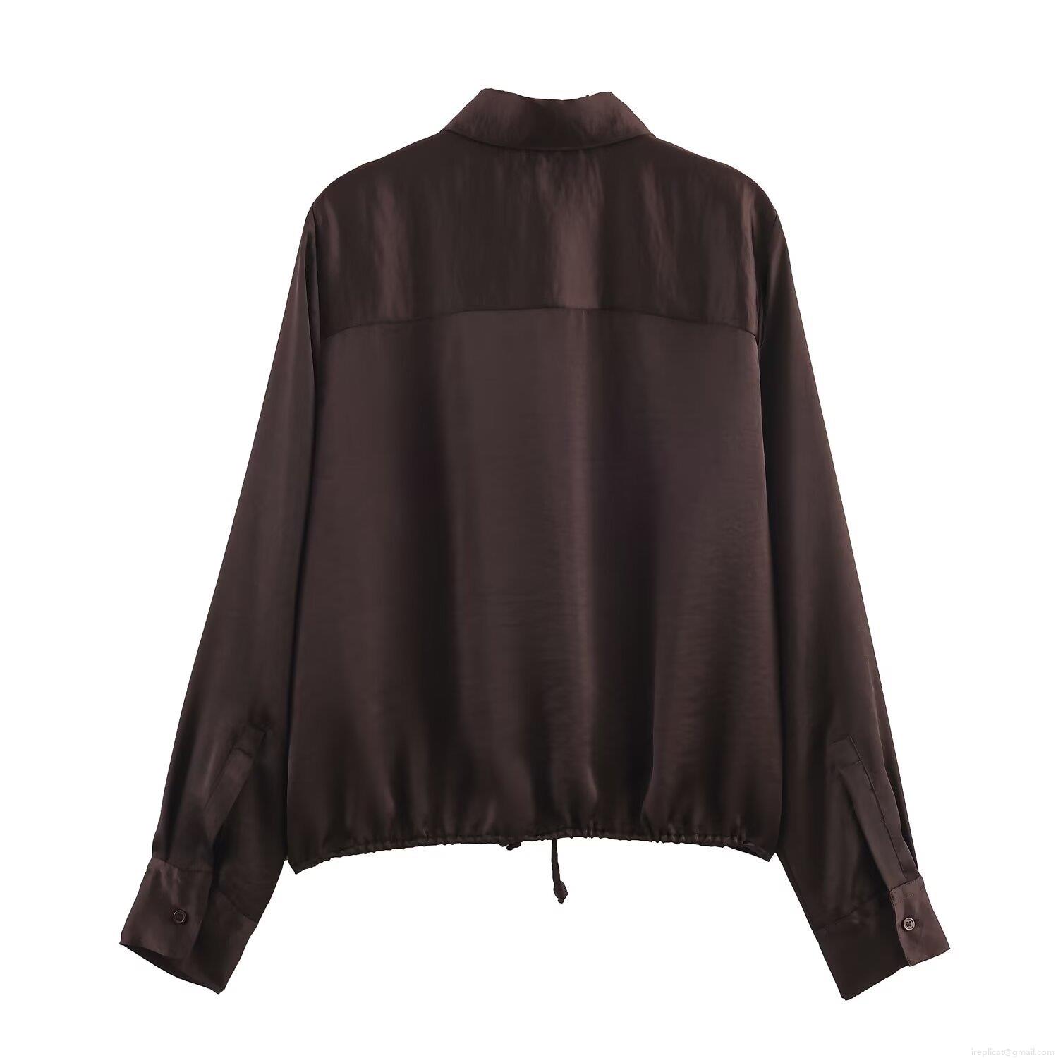 • Women Elegant Satin Texture Blouse Long Sleeve Drawstring Hem Shirt Collar Button Down Solid Color Glossy Top For Office Party Daily Wear