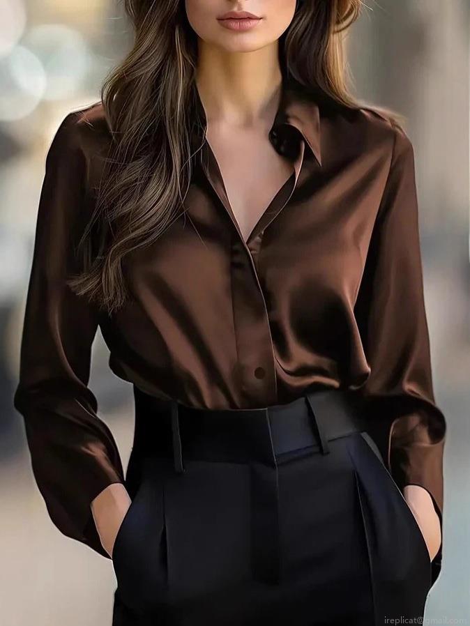 • Women Elegant Satin V-Neck Long Sleeve Blouse Silky Button Down Shirt Professional Office Commute Autumn Loose Top Fashion Blouse For Women