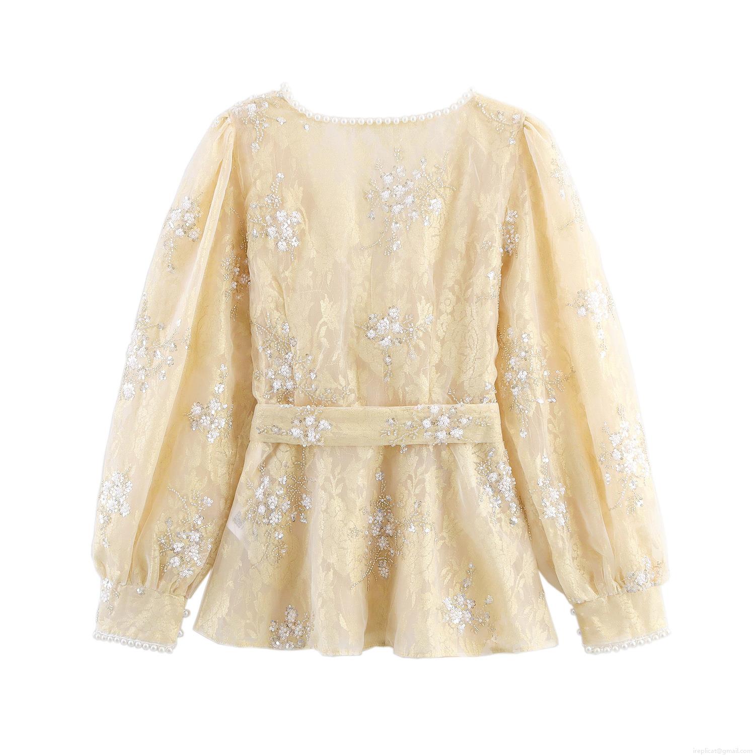 • Women Elegant Sequin Mesh V-Neck Blouse With Pearl Buckle Belt Lace Embroidery Long Lantern Sleeve Slim Waist Party Socialite Shirt Top