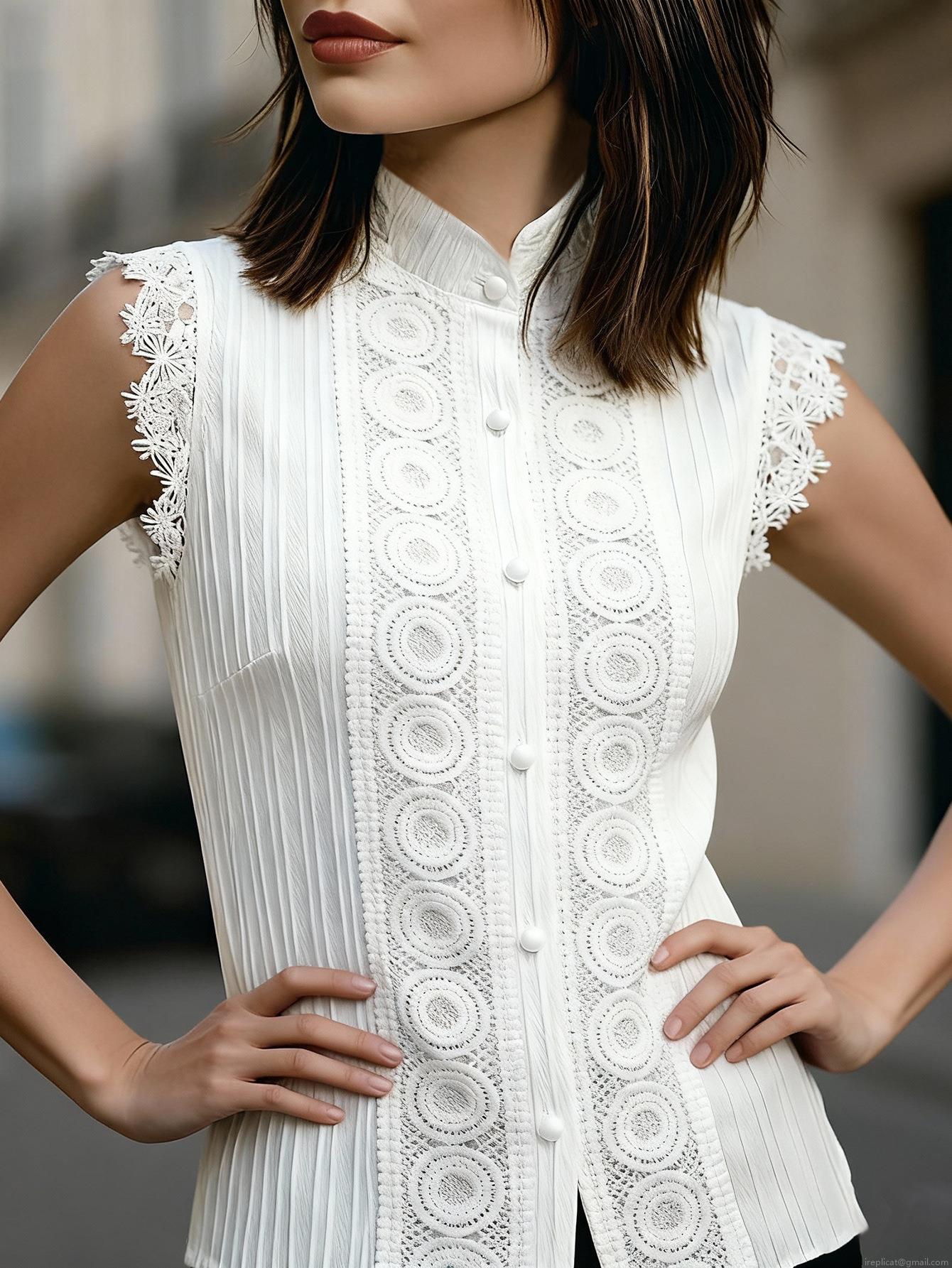 • Women Elegant Sleeveless Mandarin Collar Lace Hollow Blouse White Pleated Button Front Slim Fit Shirt For Commute Office Daily Lady Tops