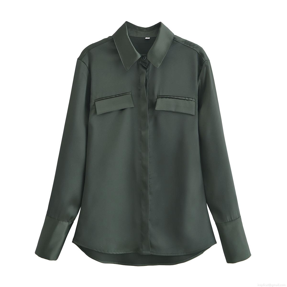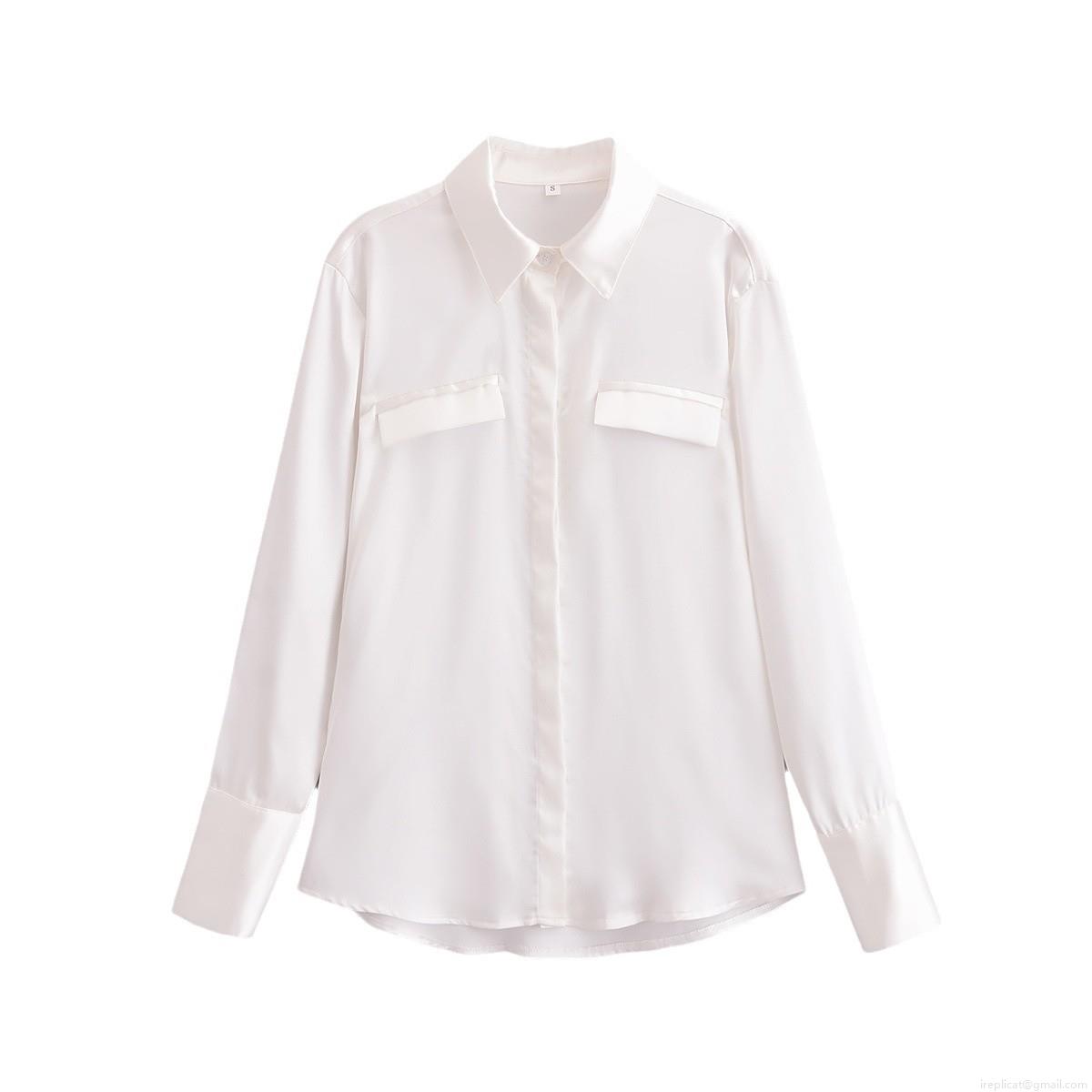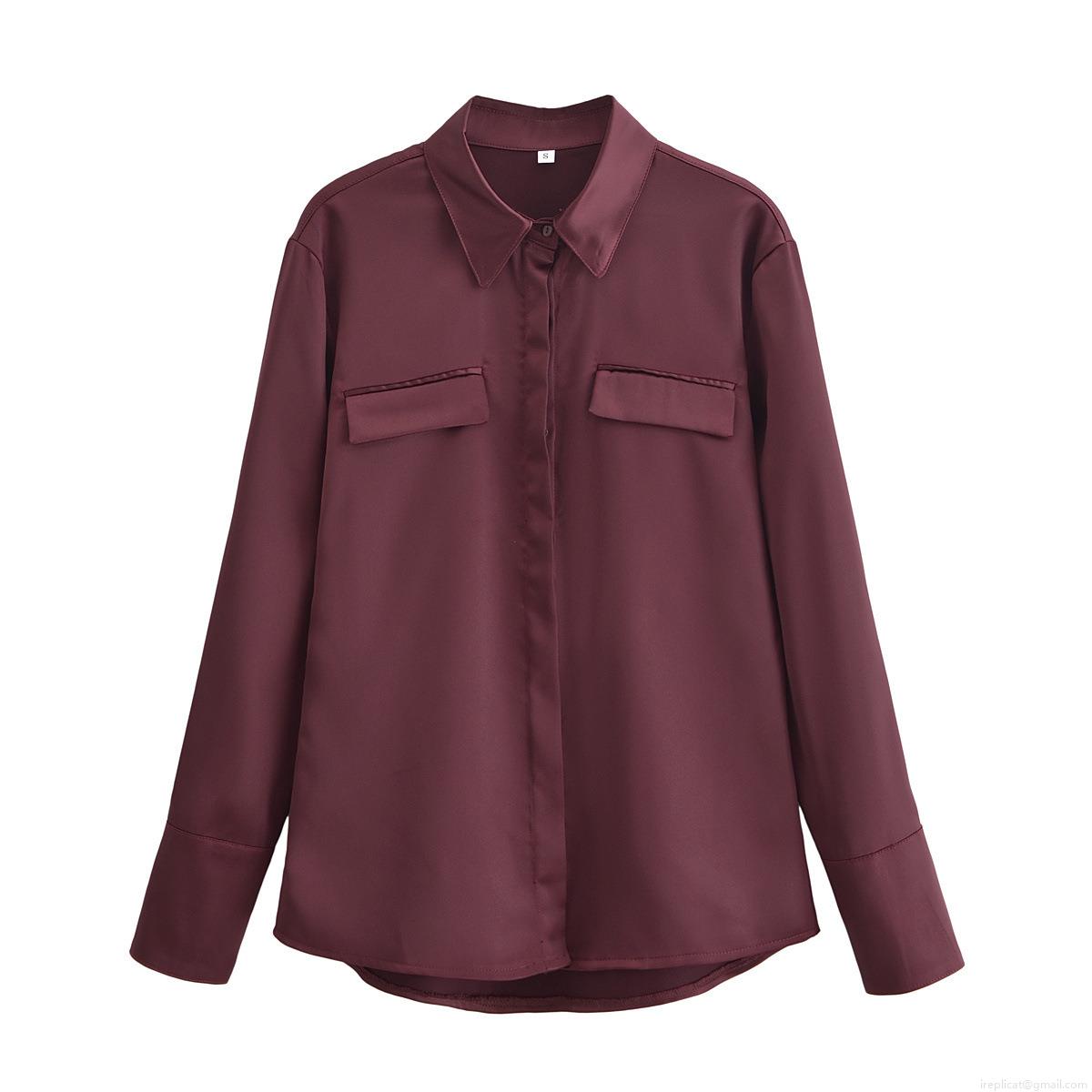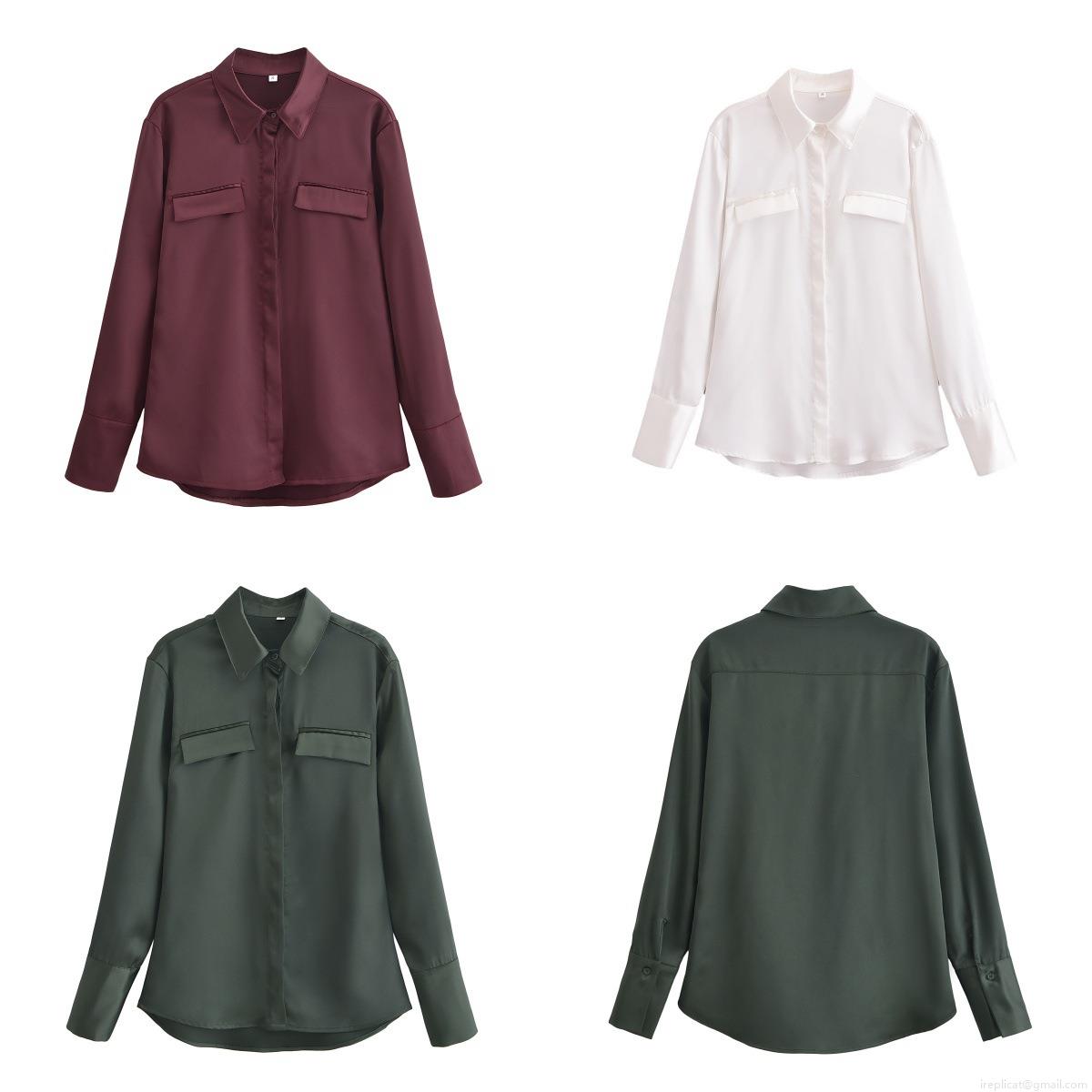 • Women Elegant Solid Color Satin Long Sleeve Shirt Top With Double Pockets Button Down Lapel Blouse Polyester For Office Daily Streetwear Spring Fashion