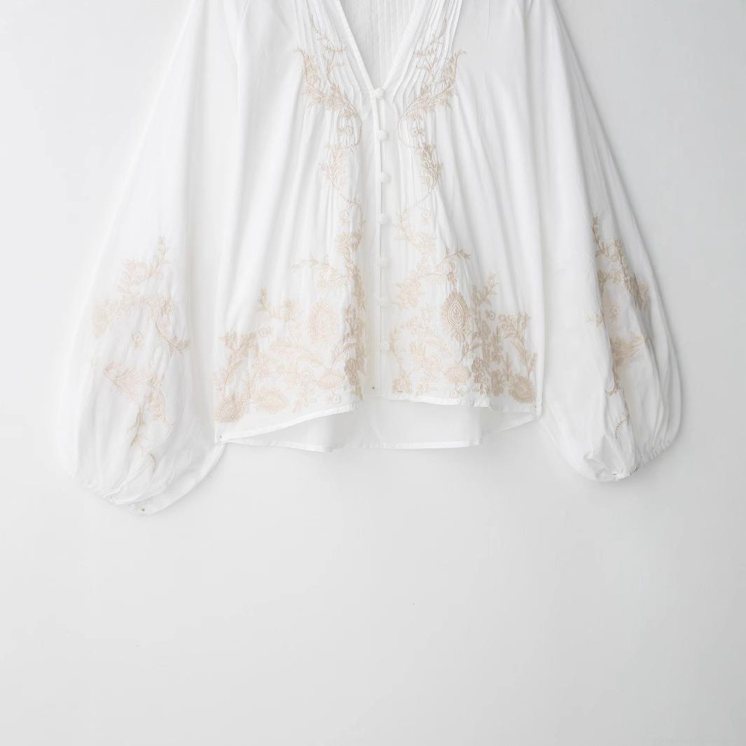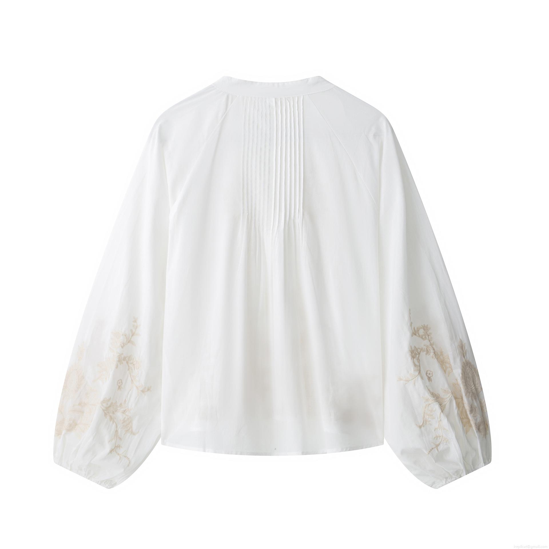 • Women Elegant V Neck Embroidered Floral Shirt Button Down Long Lantern Sleeve Pleated Blouse Casual White Top For Spring Autumn Ladies