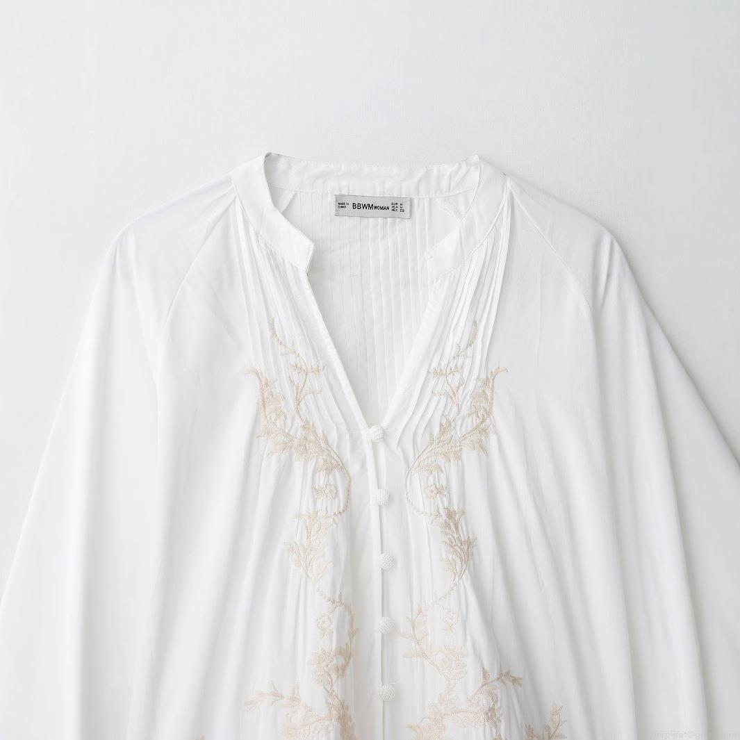 Women Elegant V Neck Embroidered Floral Shirt Button Down Long Lantern Sleeve Pleated Blouse Casual White Top For Spring Autumn Ladies