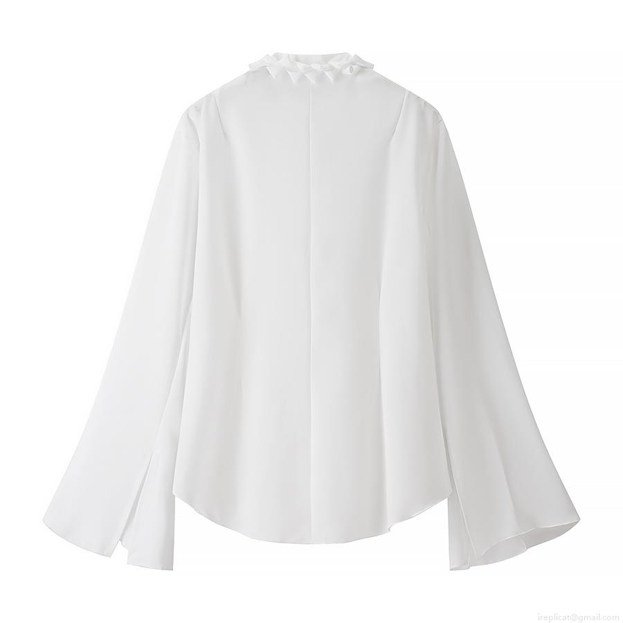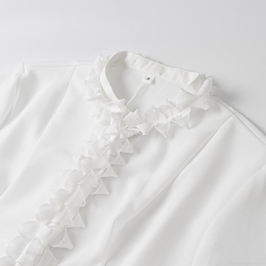 • Women Elegant V-Neck Chiffon Blouse With Flare Sleeve Ruffle Wood Ear Trim Solid White Long Sleeve Button Down Shirt For Office Dating Lady Tops