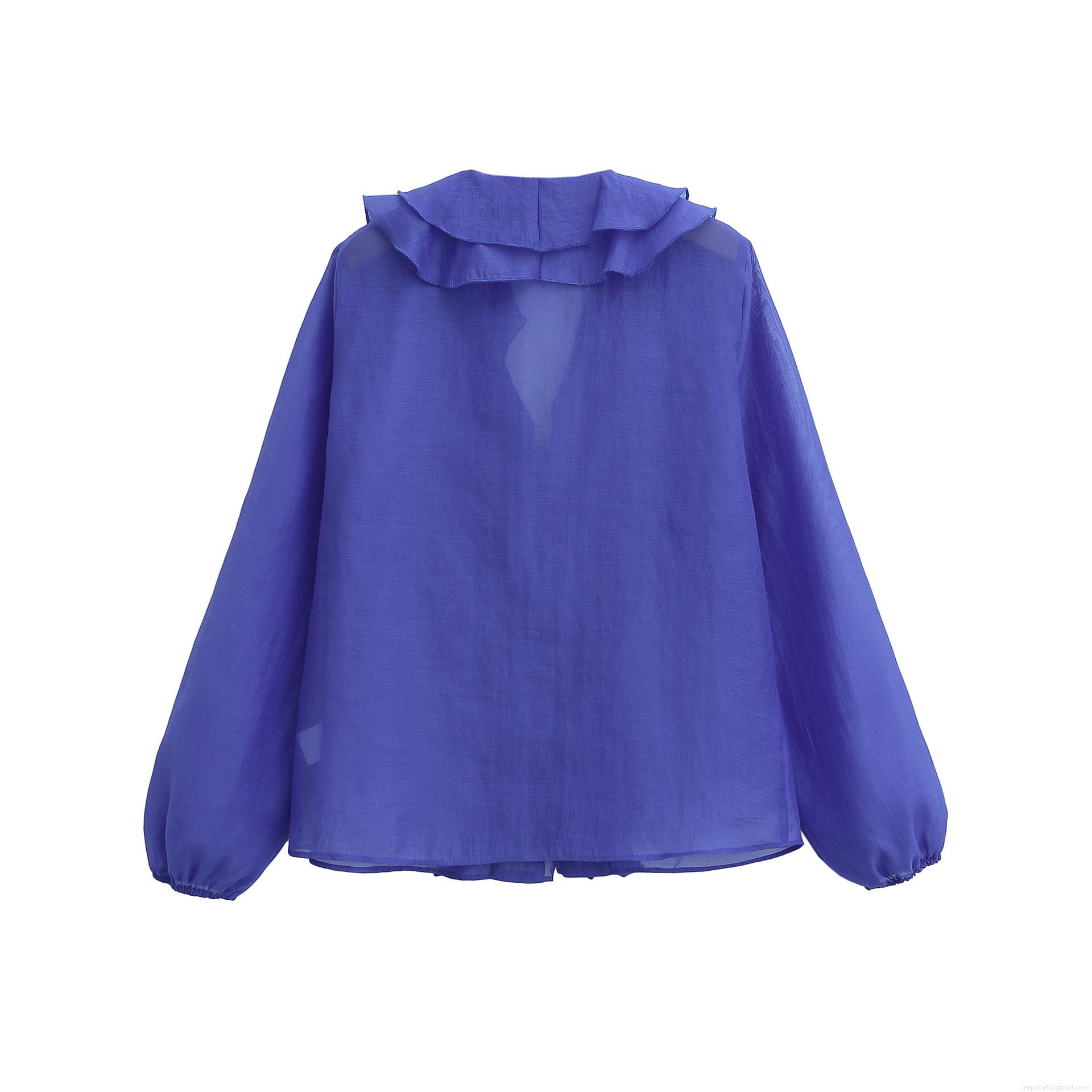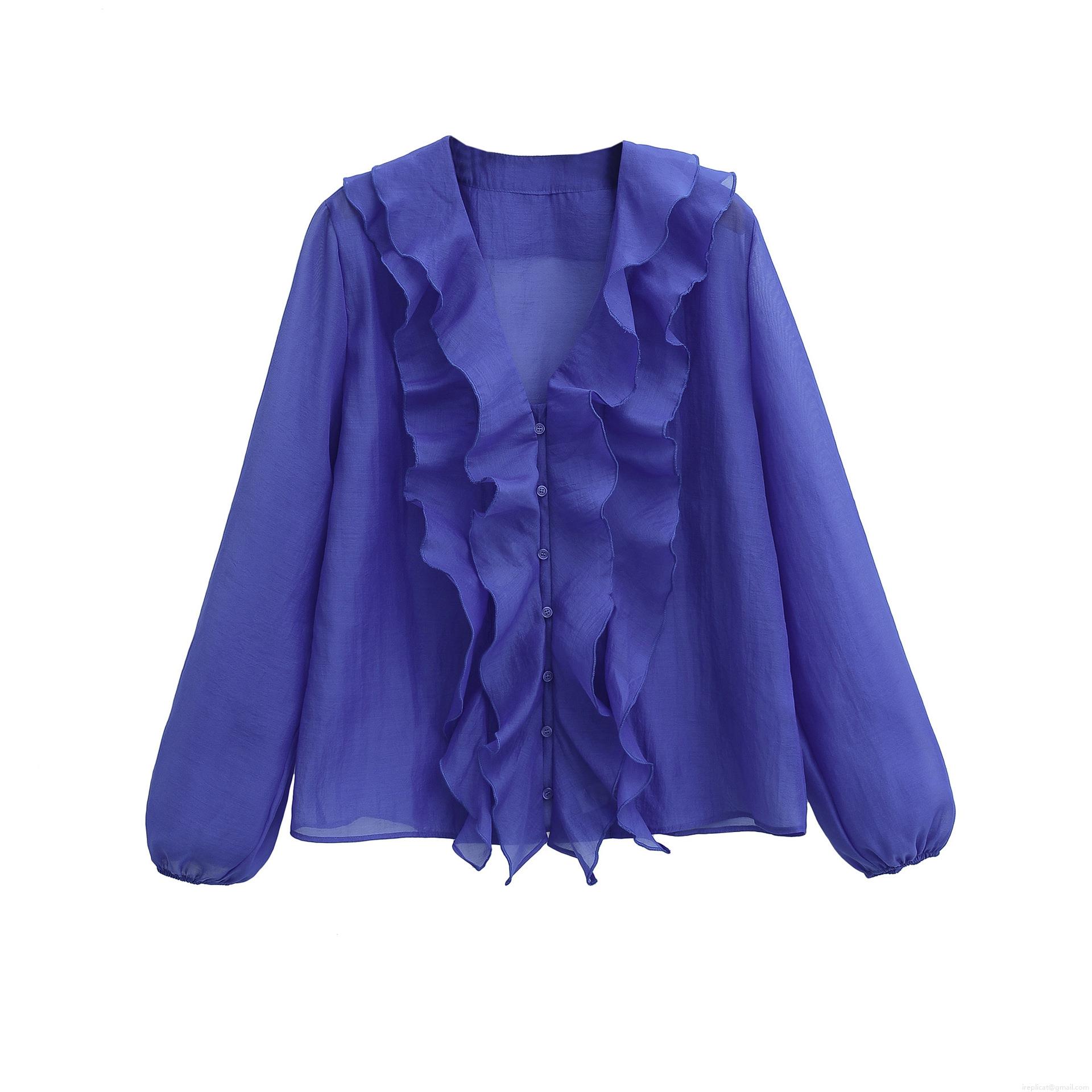 • Women Elegant V-Neck Ruffle Chiffon Blouse Long Lantern Sleeve Solid Color Button Up Shirt Fashion Casual Streetwear Top Female Clothing