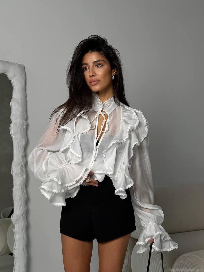 • Women Elegant White Ruffle Chiffon Blouse V Neck Tie Up Flare Long Sleeve Translucent Mesh Shirt For Spring Autumn Daily Dating Party Lady Vintage French Style Top