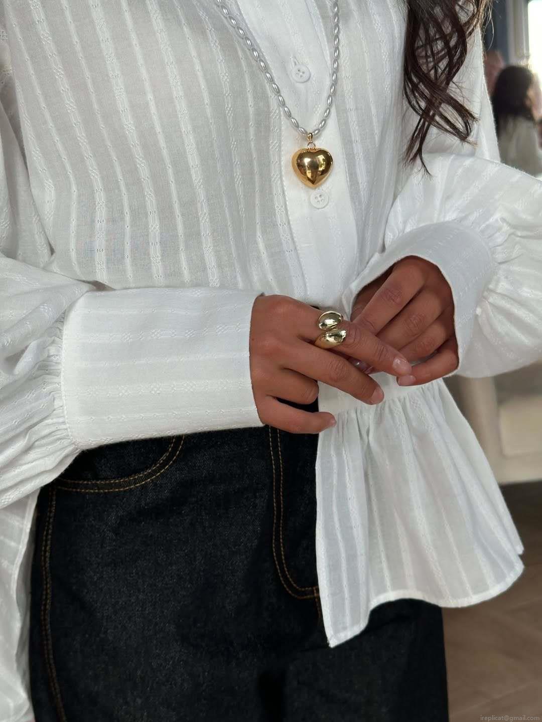 • Women European Style White Striped Ruffle Blouse Casual Loose Puff Long Sleeve Shirt Cotton Blend Single Breasted Button Down Tops