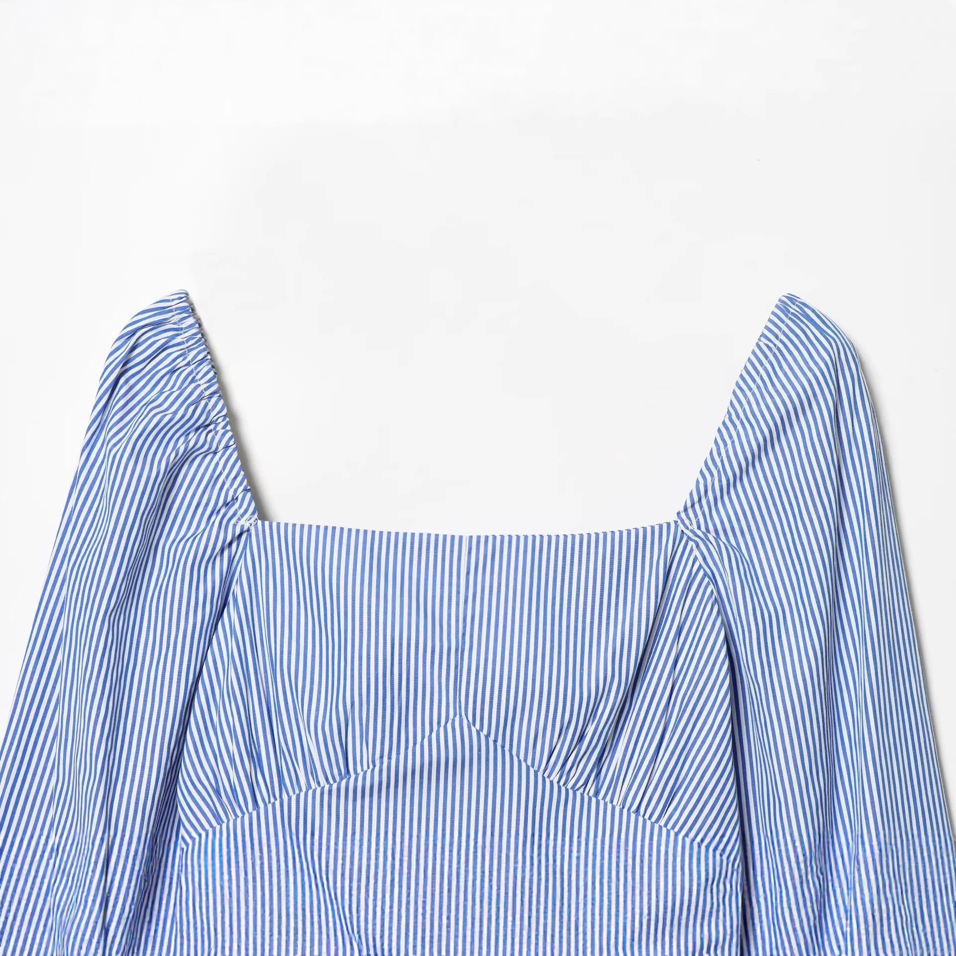 Stripe, Gathering, Slab, Puff Sleeves, Square Collar, Spliced ​​sleeves