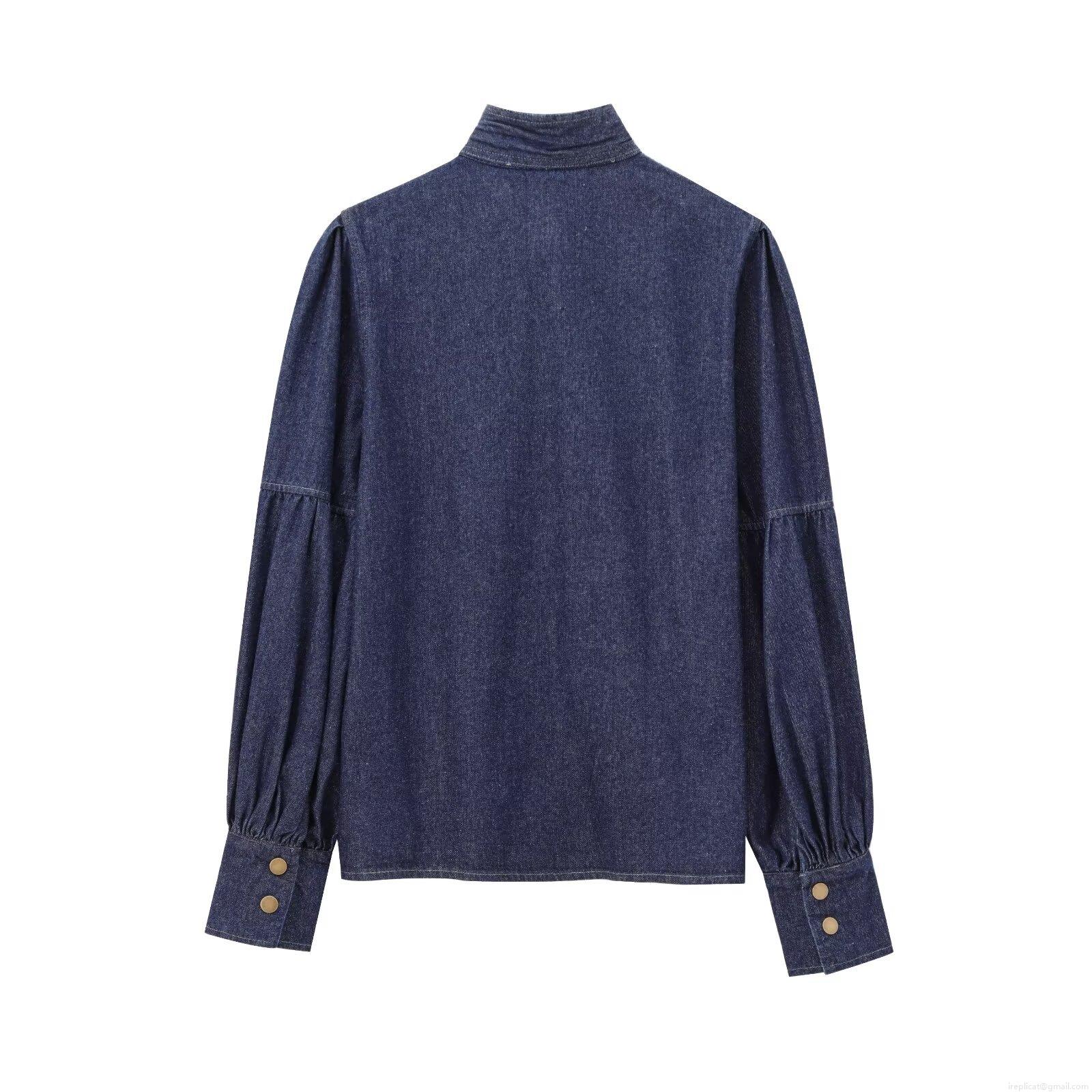 • Women Fashion Denim Shirt Long Sleeve Bow Tie Neck Lantern Sleeve Button Down Blouse Casual Streetwear Retro Denim Top For Lady