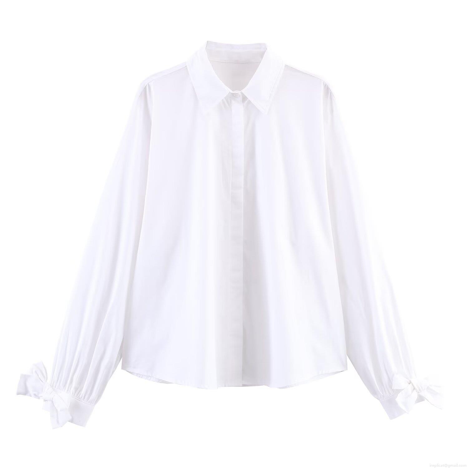 • Women Fashion Elegant Long Sleeve Poplin Shirt With Bow Tie Cuffs Striped White Brown Blouse Casual Single Breasted Lapel Top