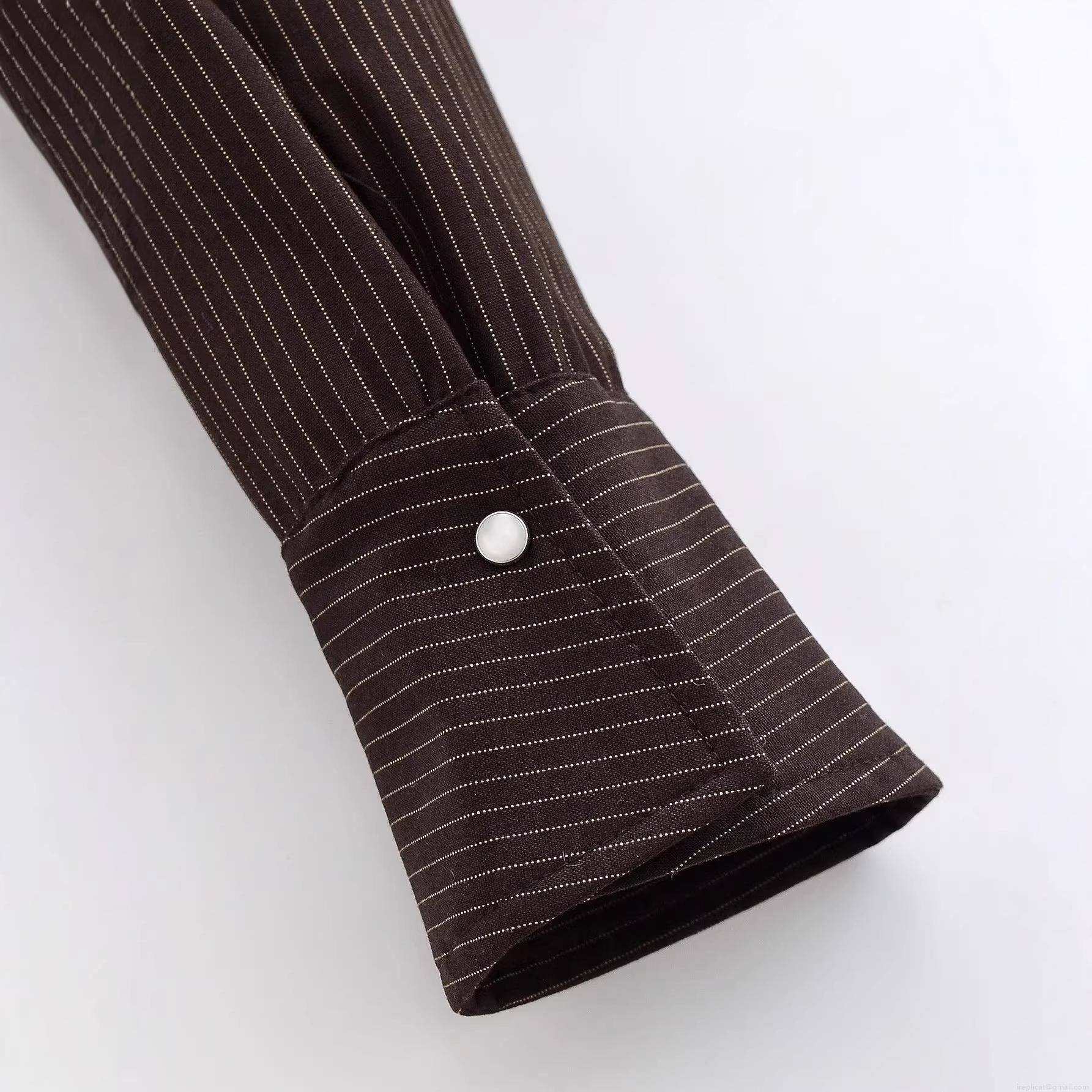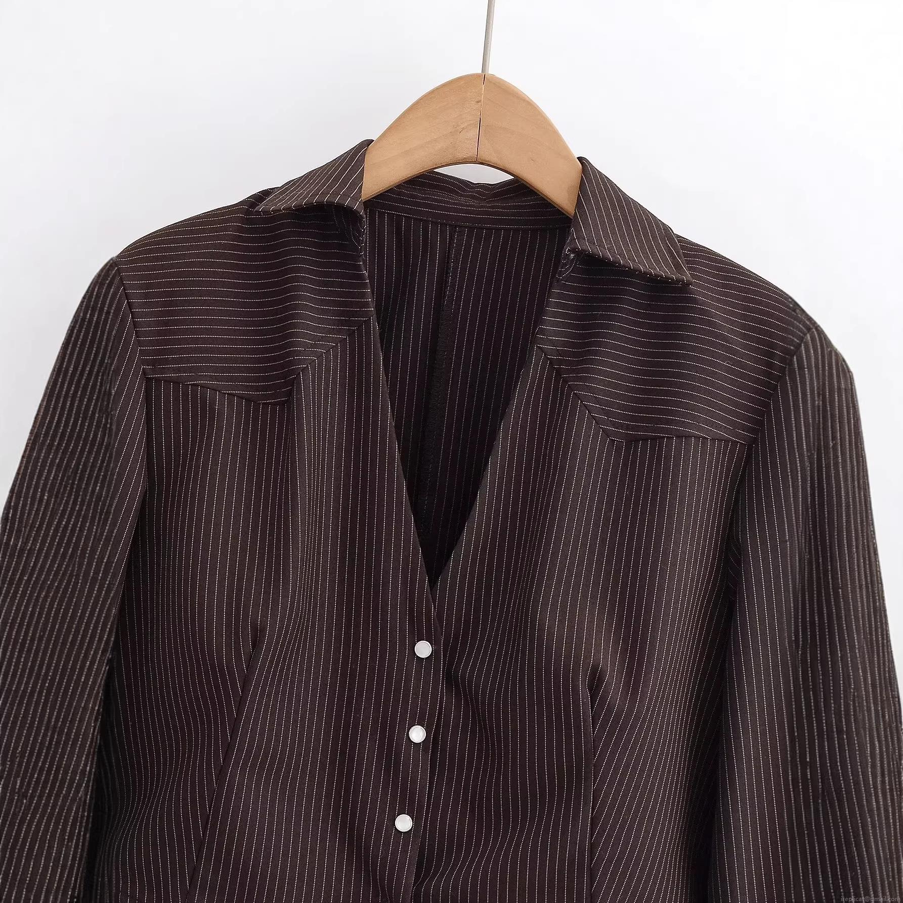 • Women Fashion Striped Cropped Shirt Jacket 100% Polyester Long Sleeve V-Neck Shoulder Padded Blouse Casual Daily Office Streetwear Chic Style