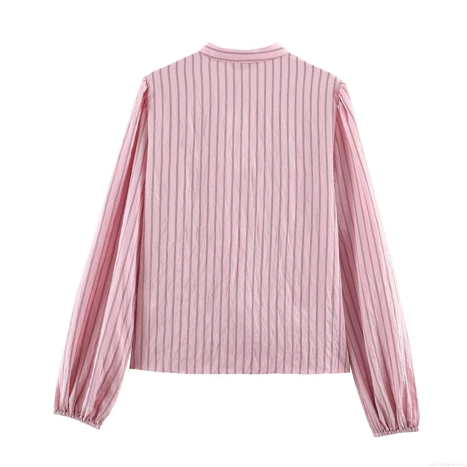 • Women Fashion Striped Long Sleeve Blouse Elegant Layered Ruffle Stand Collar Shirt Lantern Sleeve Single Breasted Casual Tops