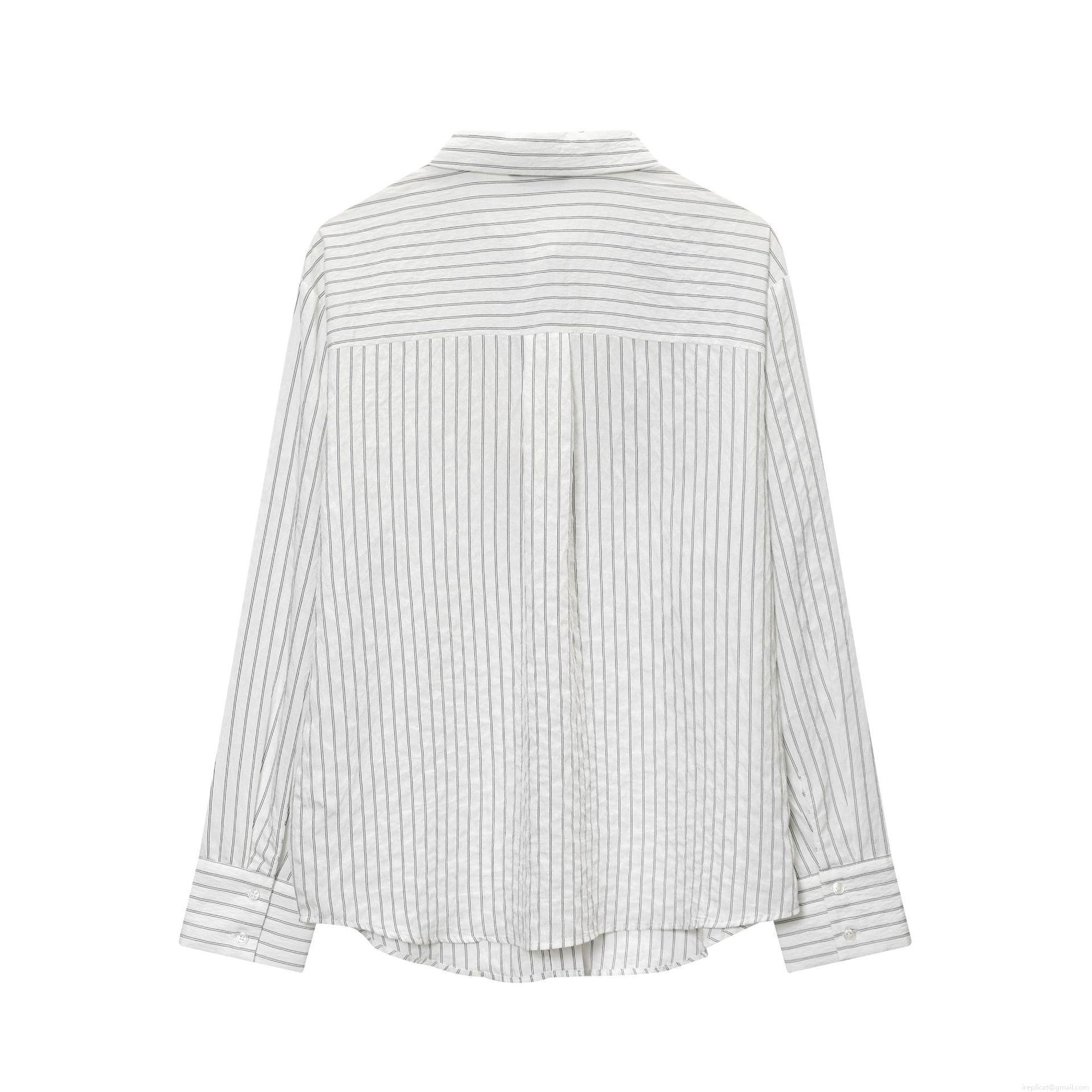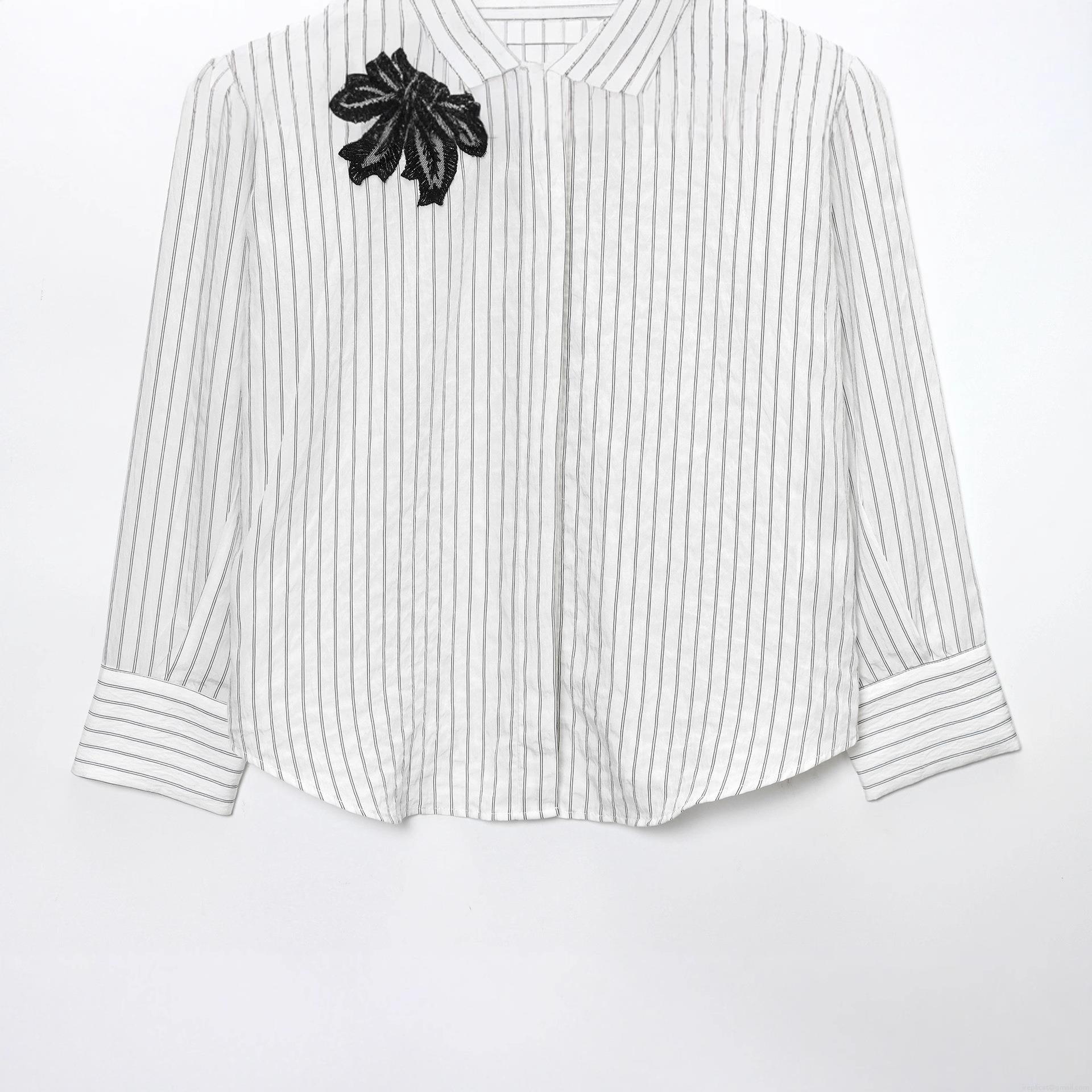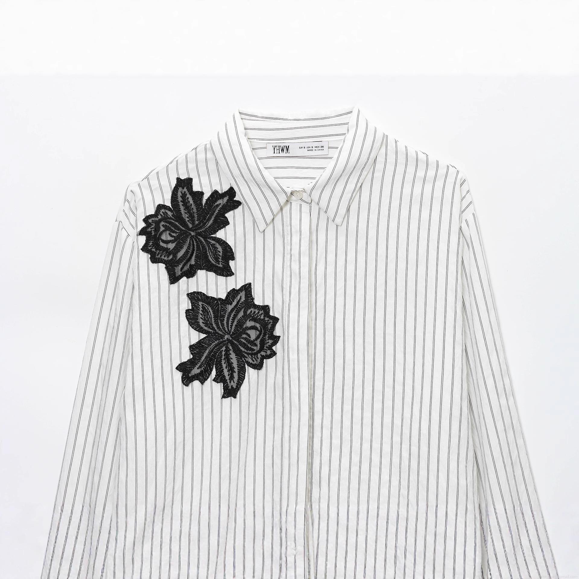 • Women Fashion Striped Long Sleeve Shirt With Black Floral Lace Embroidery Elegant Casual Button Down Polyester Cotton Blouse Top