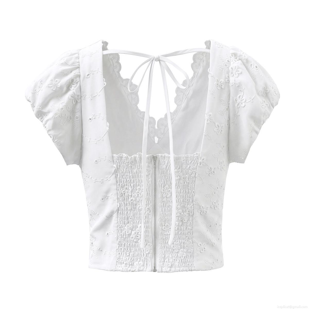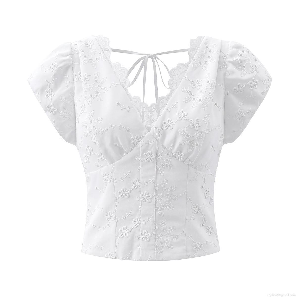 • Women Fashion V-Neck Embroidery Hollow Out Blouse Short Sleeve Puff Sleeve Top Elegant Back Zipper Tie Design Sweet Style Women's Clothing