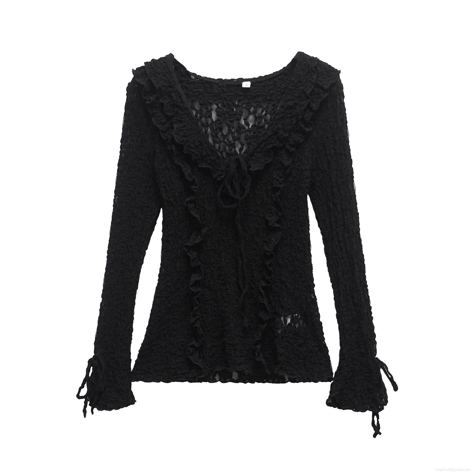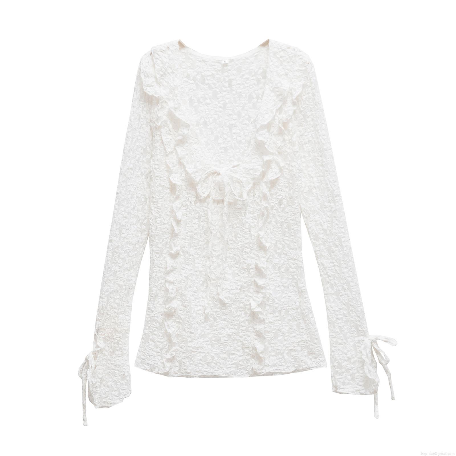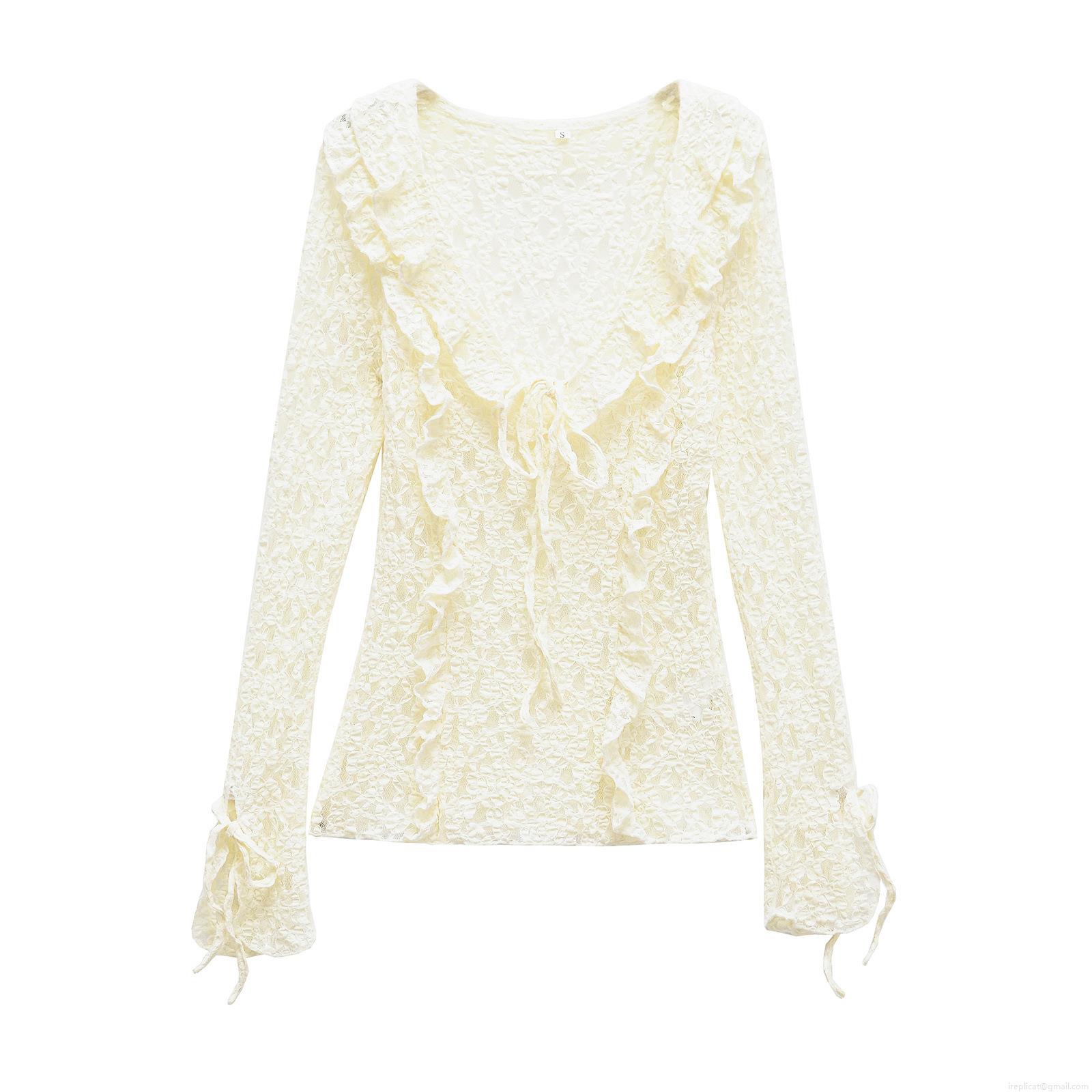 • Women Fashion V-Neck Lace Layered Long Sleeve Top Elegant Ruffle Tie-Up Mesh Blouse Streetwear Casual Solid Color Polyester T-Shirt For Ladies