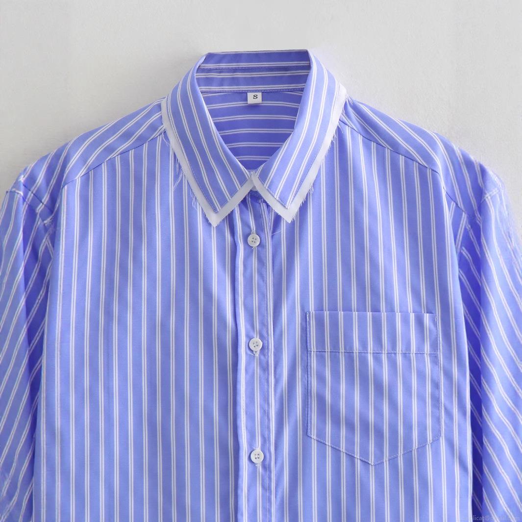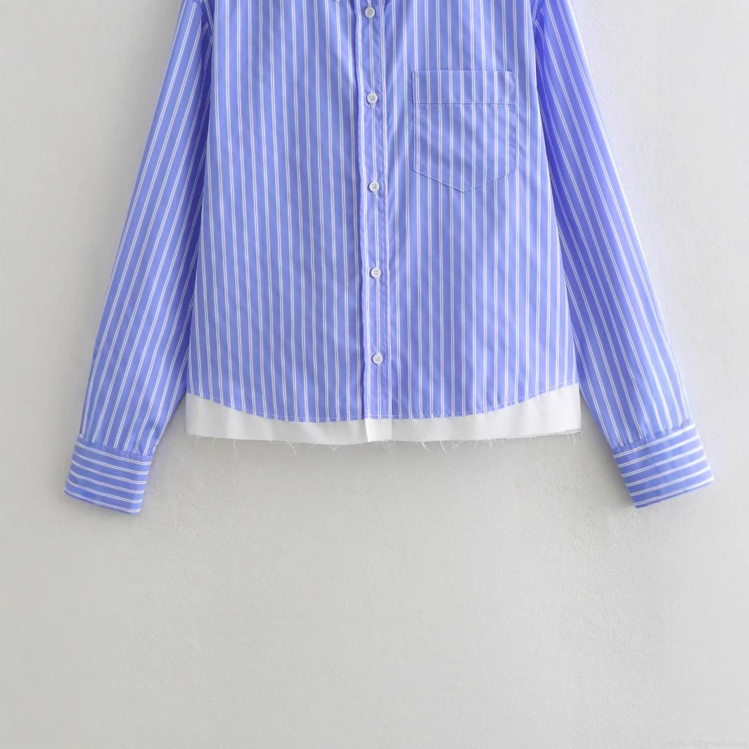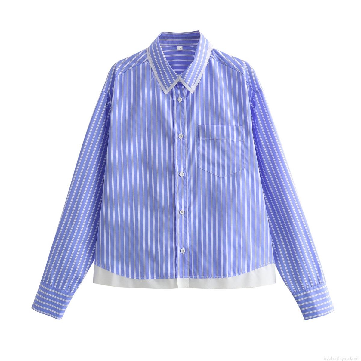 • Women Fashionable Blue and White Vertical Striped Long Sleeve Shirt Contrast Fake Two-Piece Hem Button Down Collar Blouse with Pocket for Spring Autumn Daily Casual Office Lady Streetwear