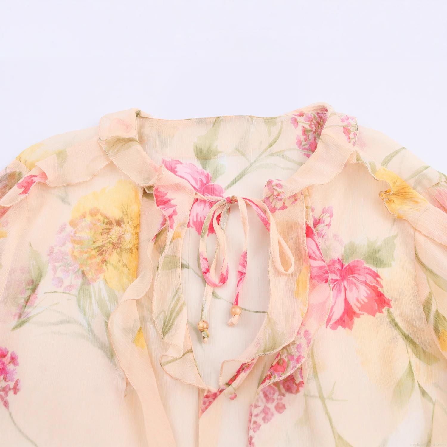 • Women Floral Print Chiffon Blouse Elegant V Neck Ruffle Long Sleeve Shirt Lightweight Semi-Transparent Top With Wood Beads Tie For Daily Date Casual Spring
