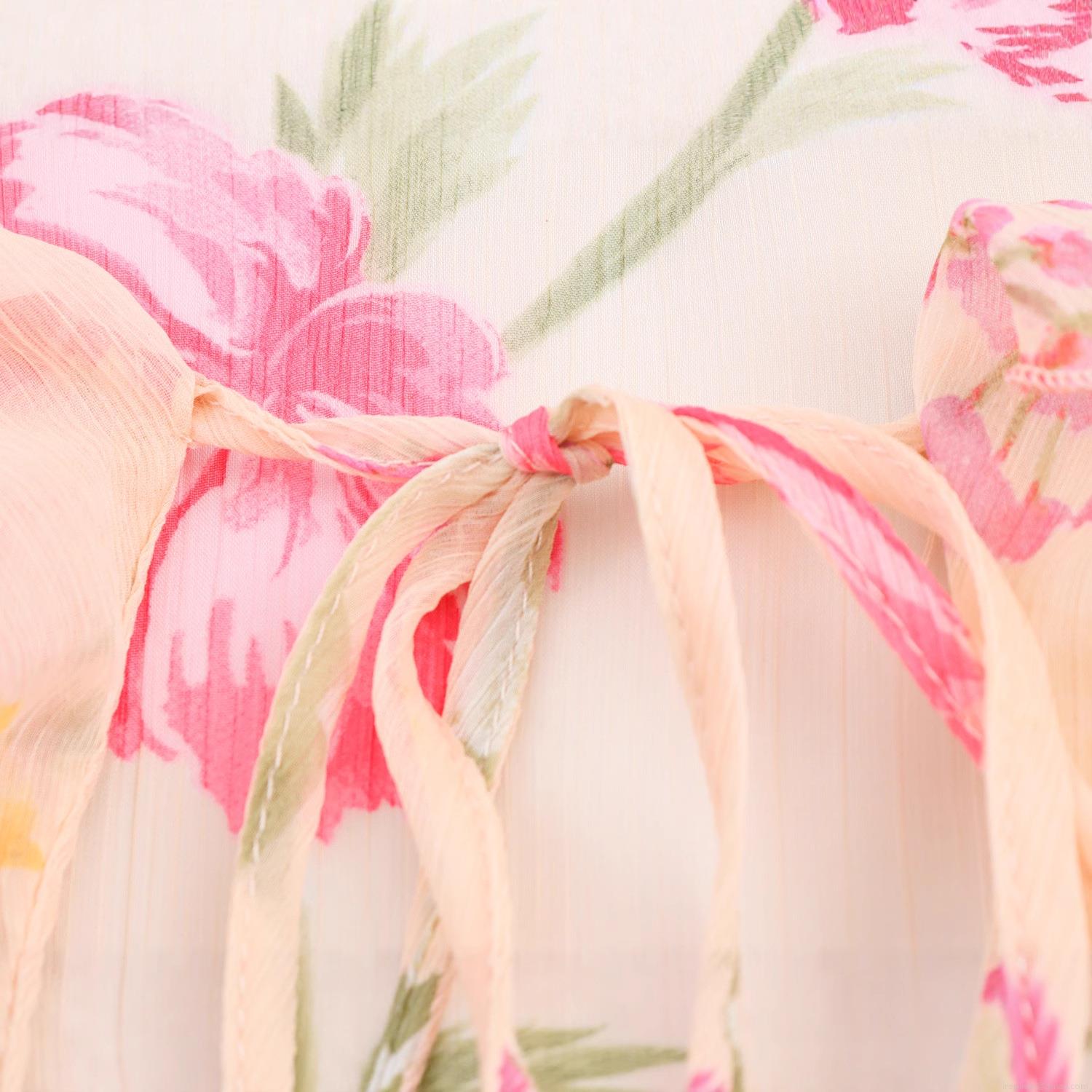 Women Floral Print Chiffon Blouse Elegant V Neck Ruffle Long Sleeve Shirt Lightweight Semi-Transparent Top With Wood Beads Tie For Daily Date Casual Spring
