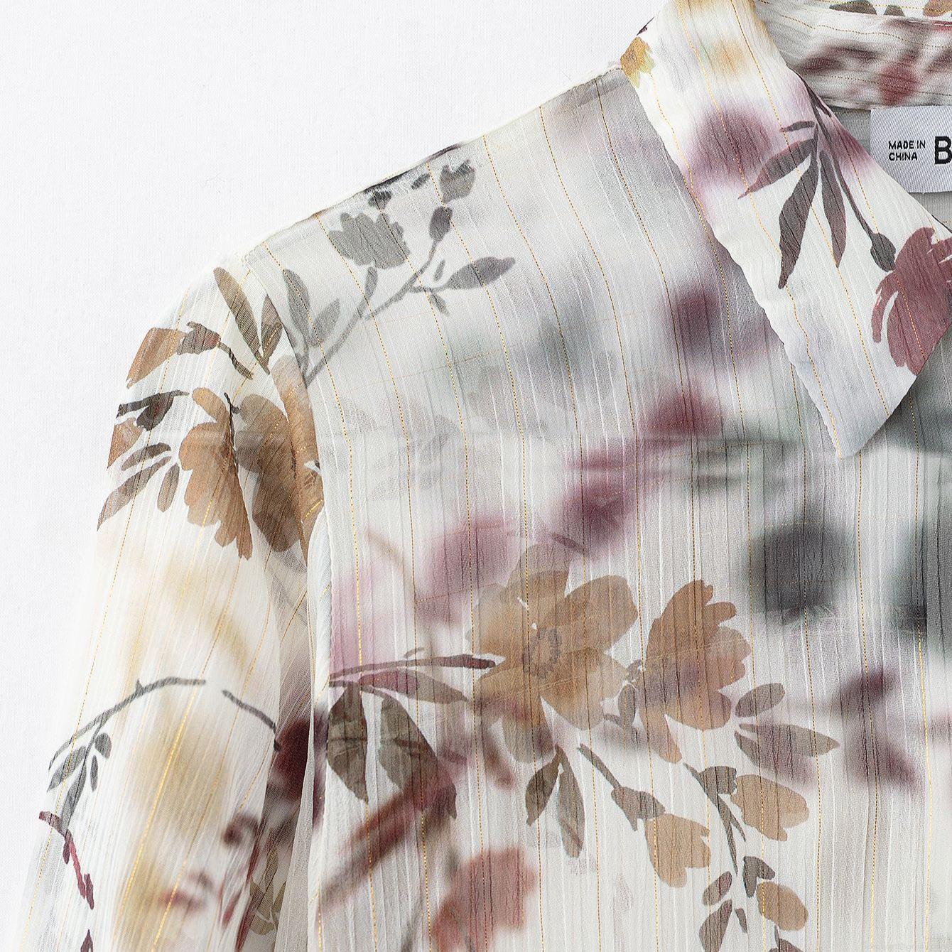 • Women Floral Print Metallic Thread Chiffon Blouse Elegant Long Flared Sleeve Ruffle Cuff Button Down Shirt Lapel V Neck Office Casual Top