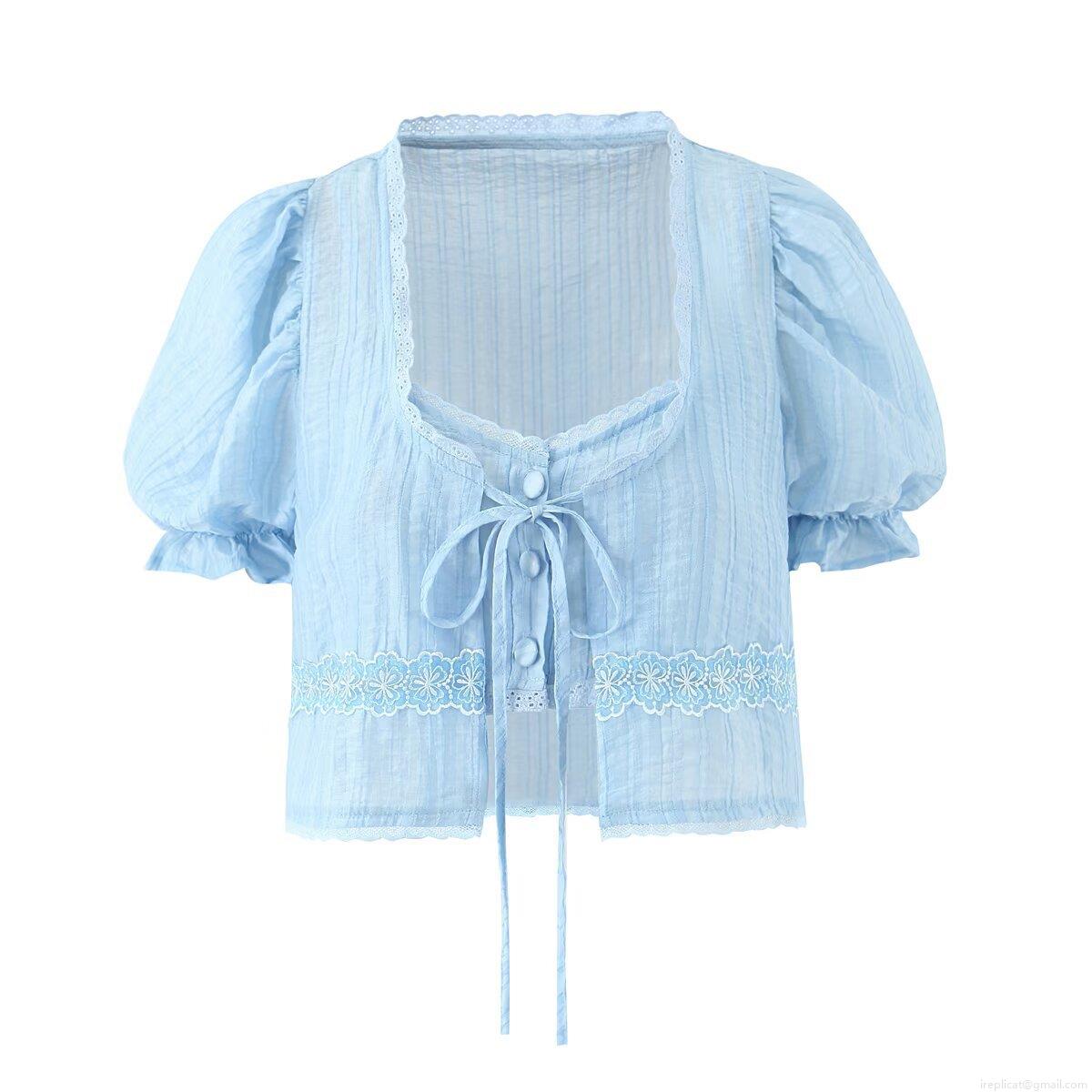 • Women French Puff Sleeve Tie Front Lace Blouse And Ruffle Camisole Sweet Crop Top Short Sleeve Summer Shirt For Lady Fashion Casual Sweet Style