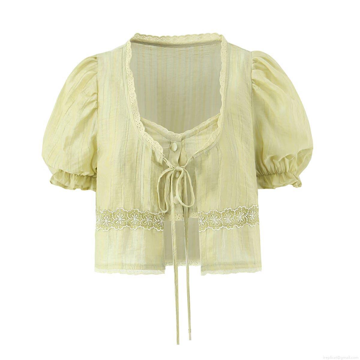 Women French Puff Sleeve Tie Front Lace Blouse And Ruffle Camisole Sweet Crop Top Short Sleeve Summer Shirt For Lady Fashion Casual Sweet Style
