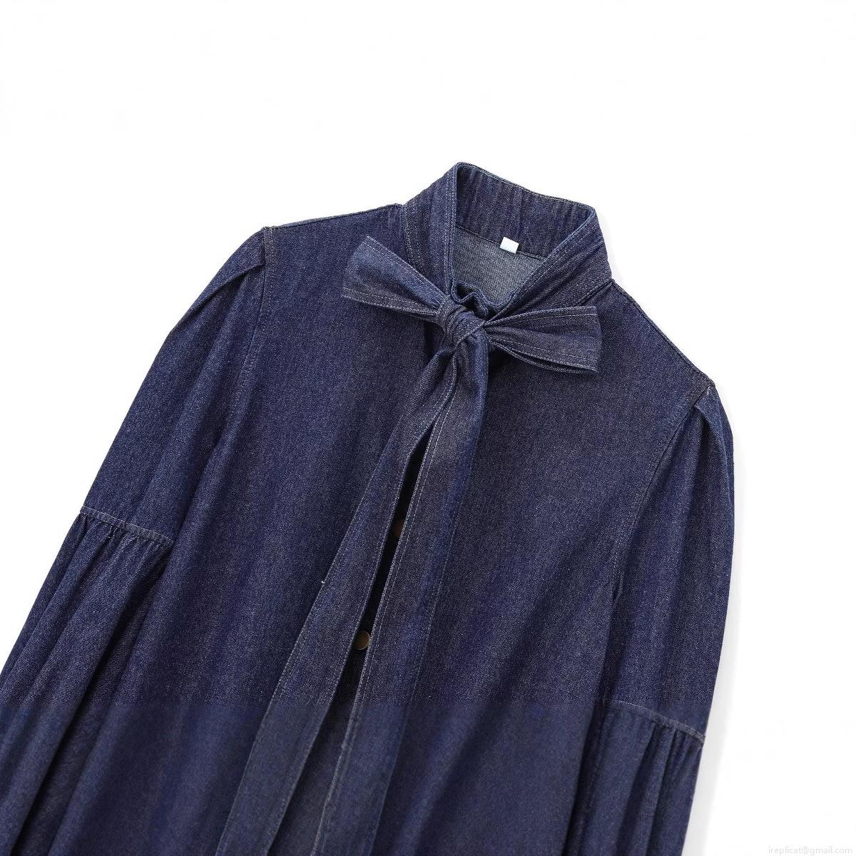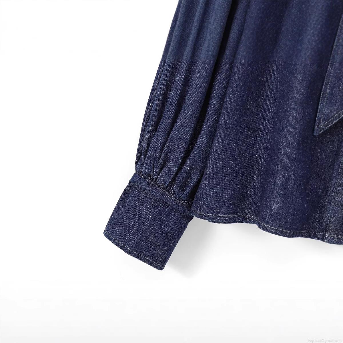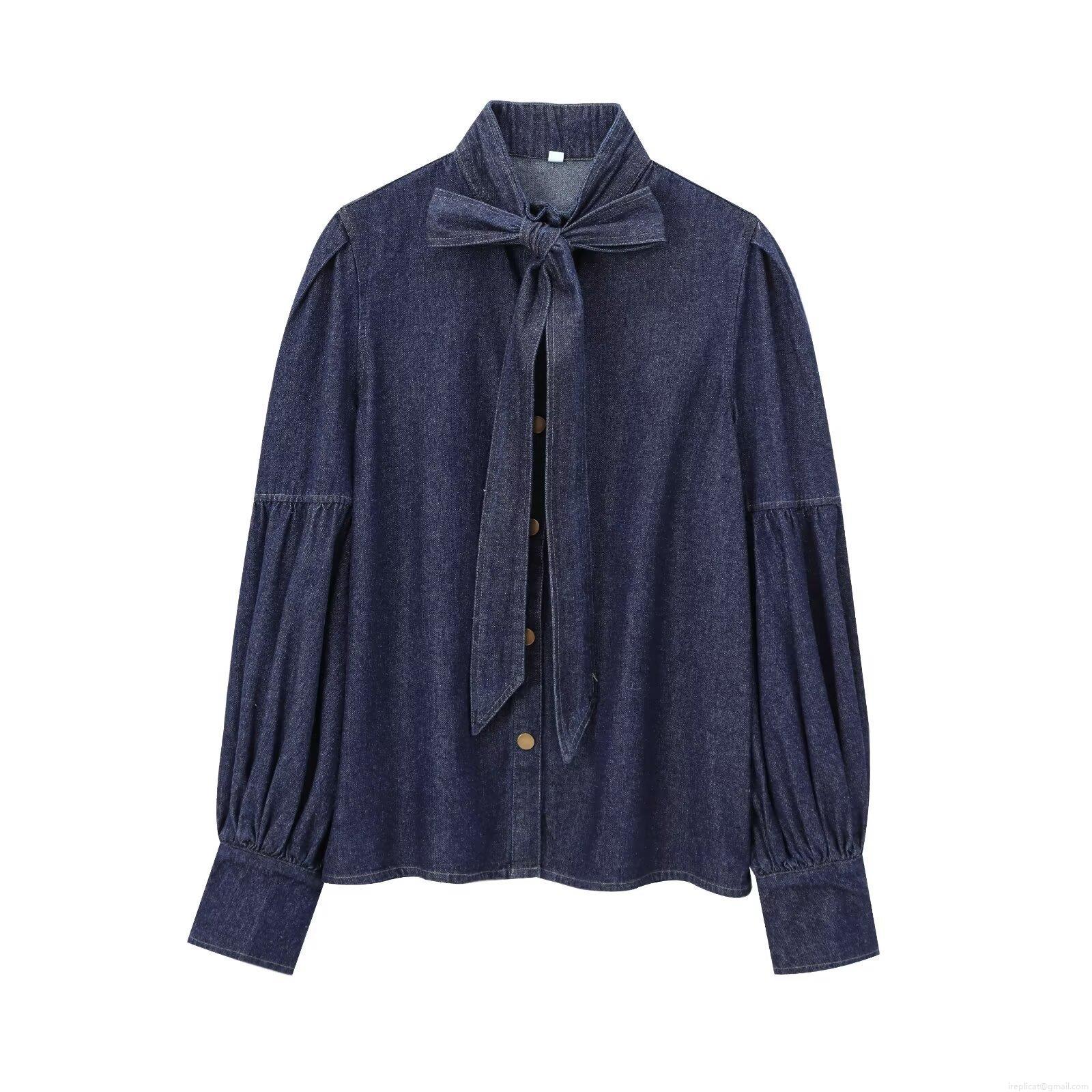 • Women French Retro Cotton Denim Shirt Bow Tie Neck Long Lantern Sleeve Casual Solid Color Button Down Blouse Top For Spring Autumn