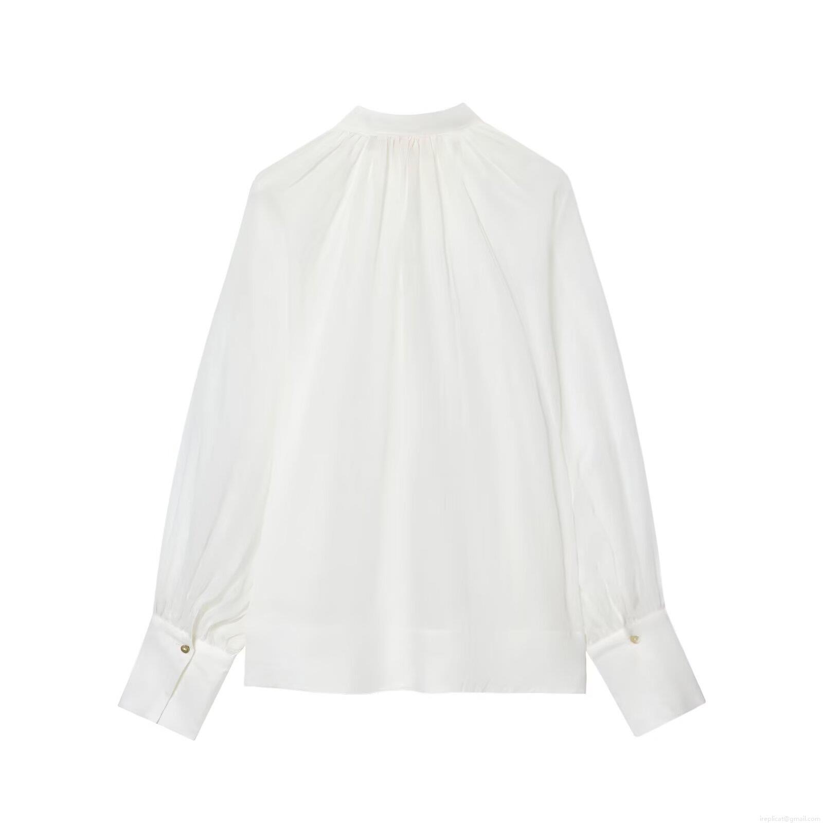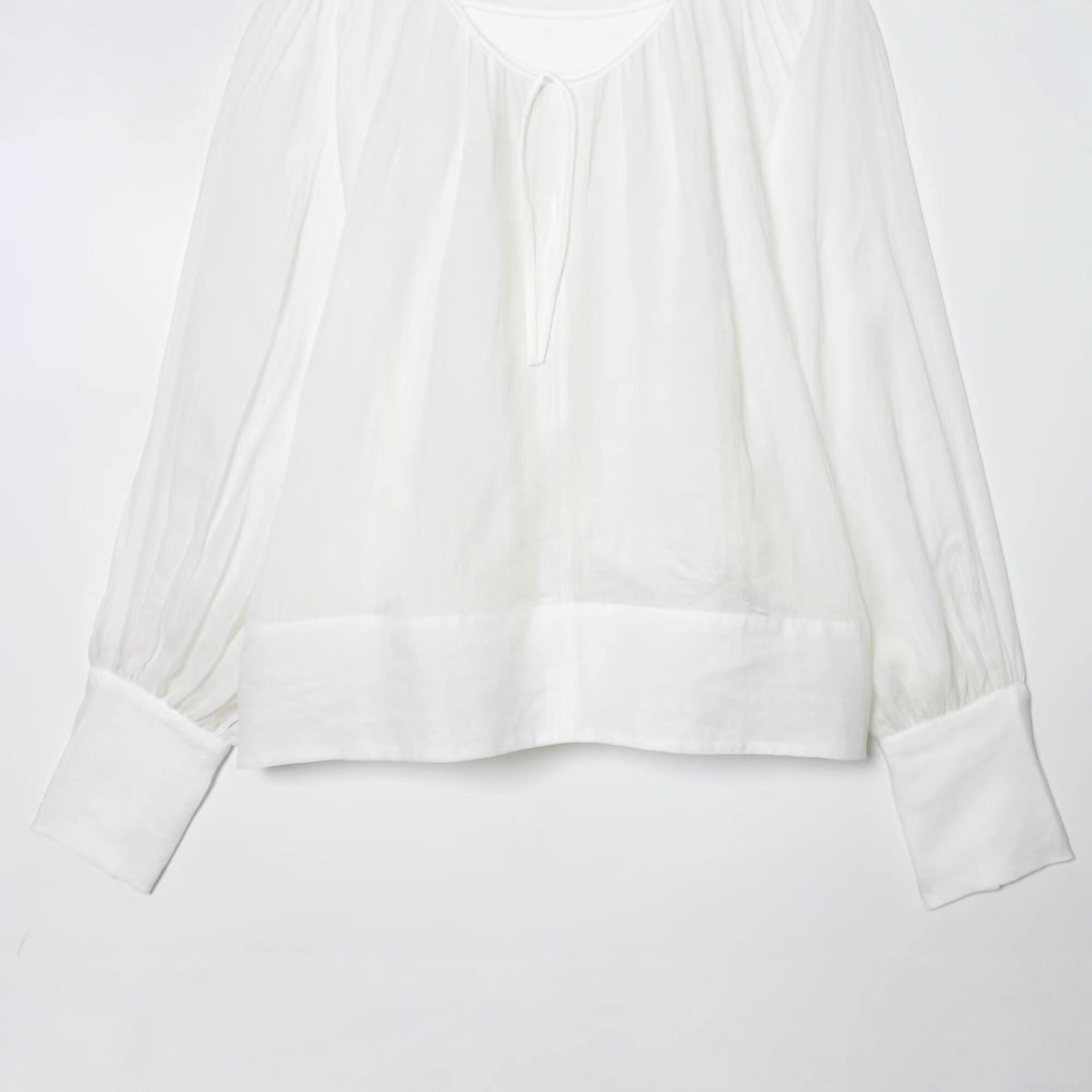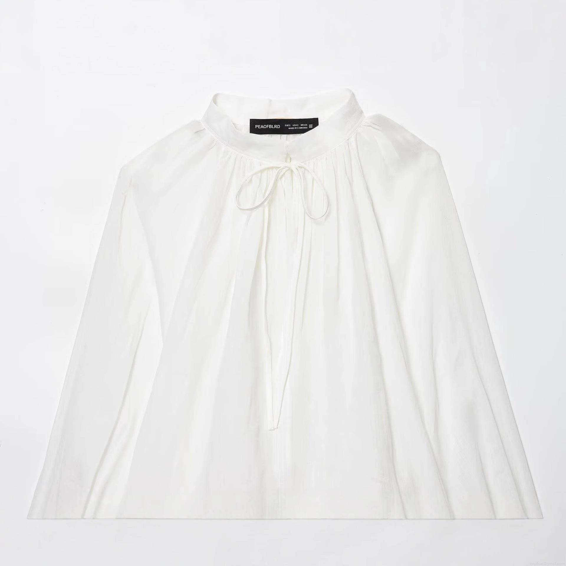 • Women French Style Stand Collar Tie Neck Blouse Elegant Lantern Long Sleeve Pleated Shirt Solid White Polyester Tops For Daily Commute