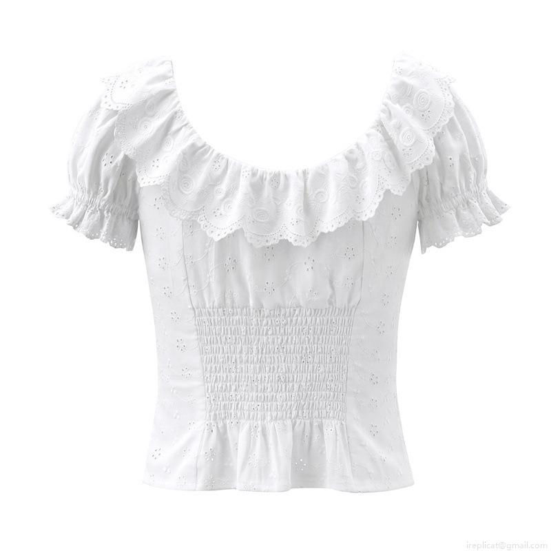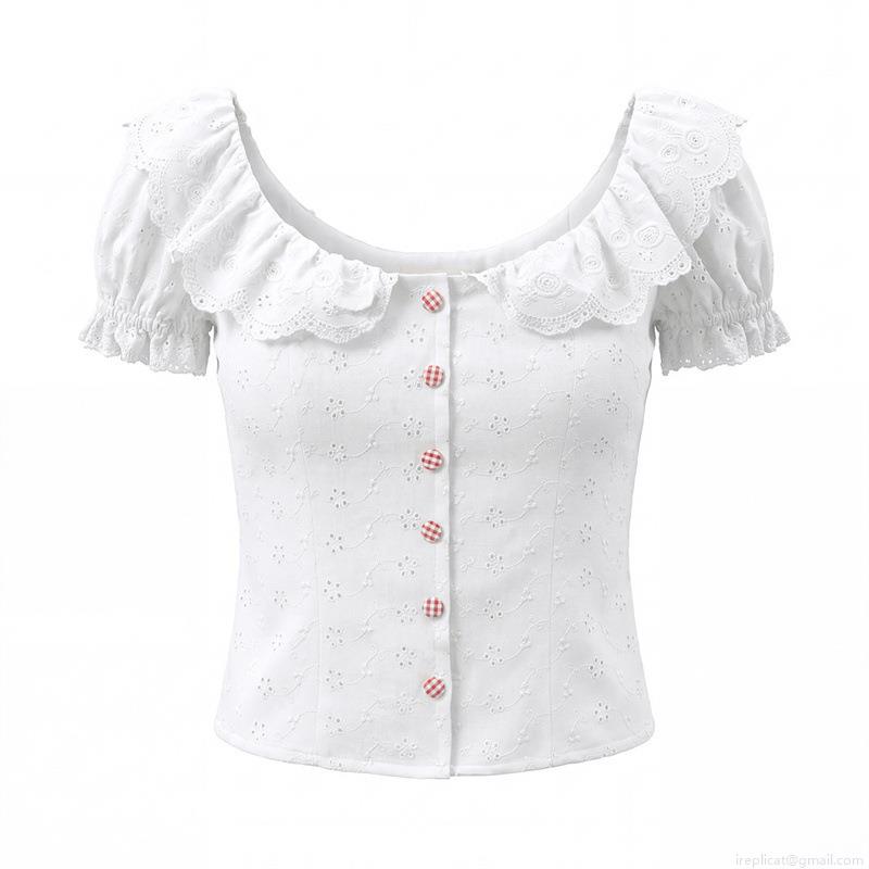 • Women French Style White Eyelet Embroidery Cotton Blouse Ruffle Collar Puff Sleeve Slim Fit Top With Gingham Buttons Sweet Elegant Summer Short Sleeve Shirt