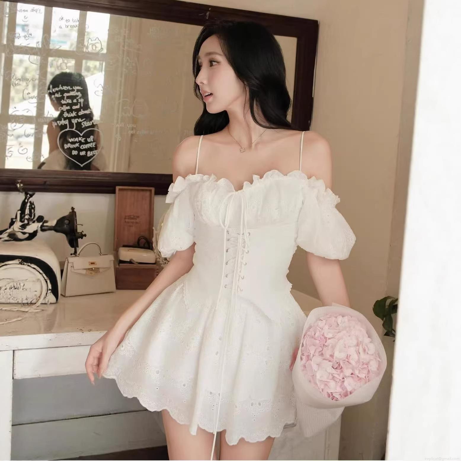 • Women French Sweet White Lace Hollow Embroidery Off-The-Shoulder Puff Sleeve Top Sexy Slim Fit Lace Up Waist Blouse For Summer Dating Party Casual Top