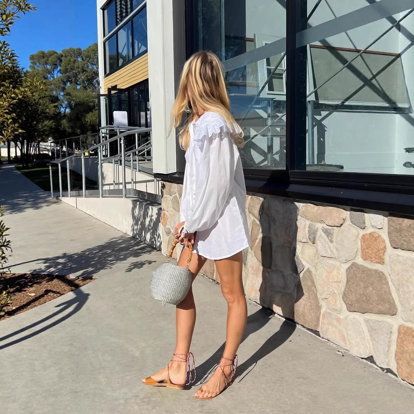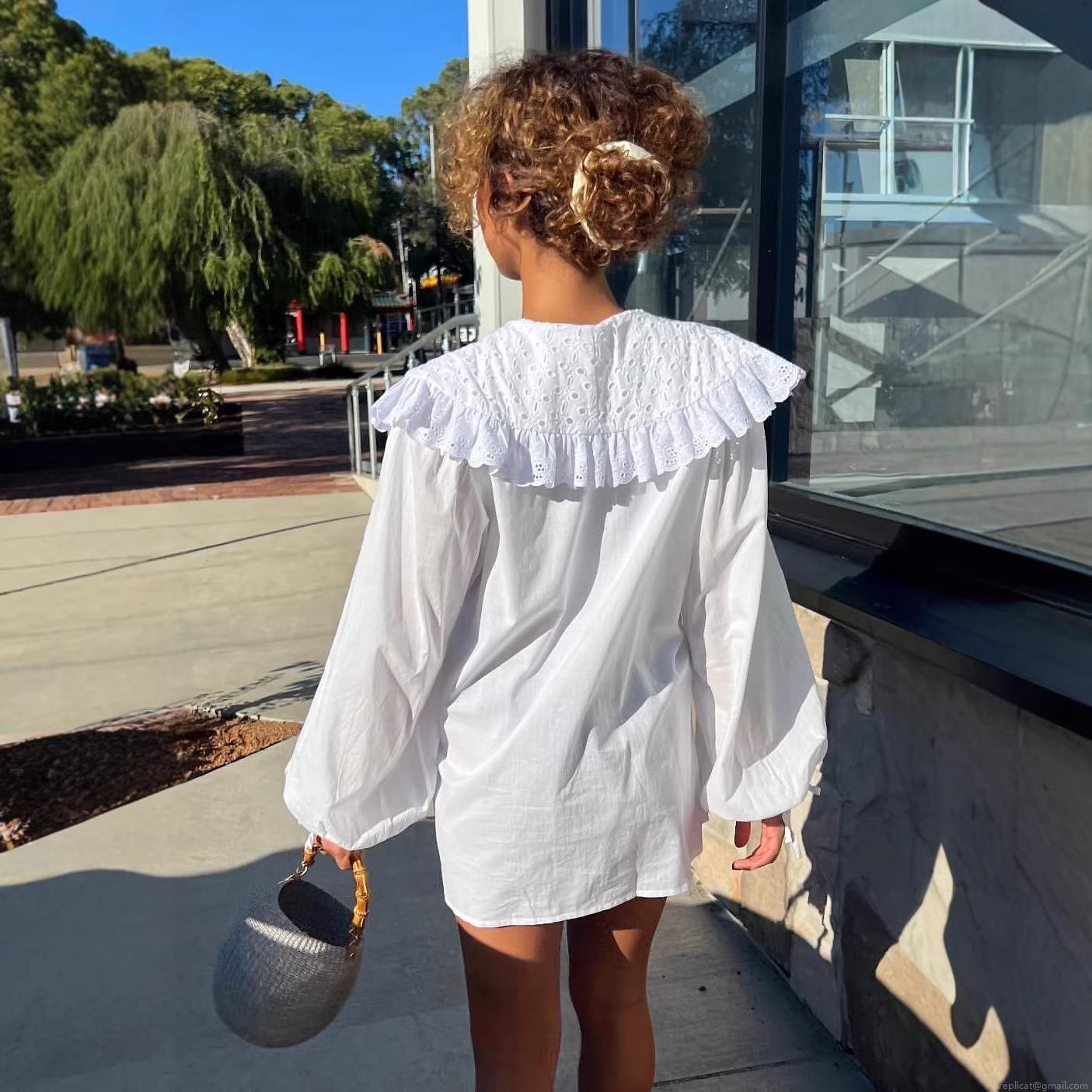 • Women French Vintage White Cotton Blouse Elegant Hollow Out Lace Peter Pan Collar Top Loose Lantern Sleeve Tied Cuffs Shirt For Spring Vacation Dating Lady