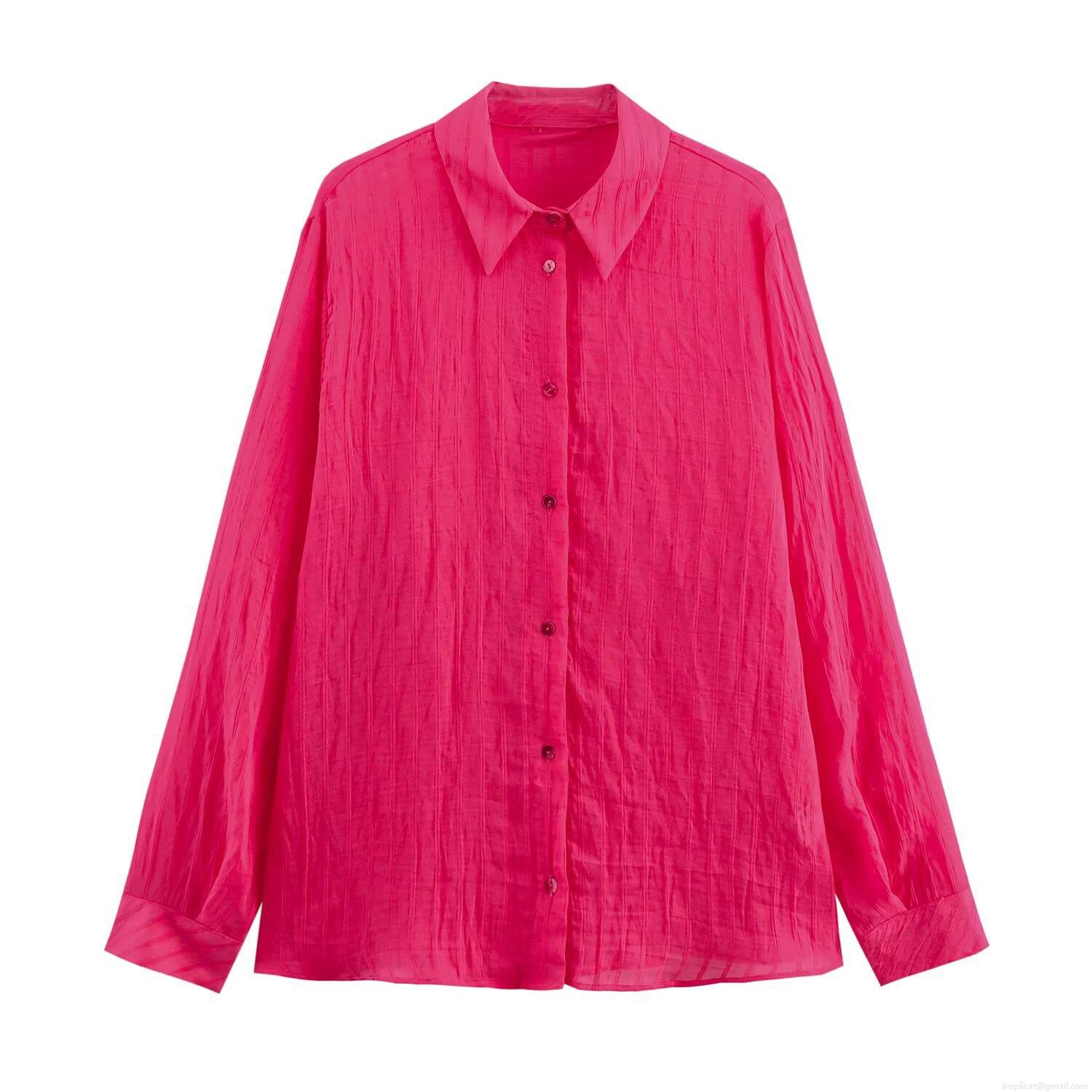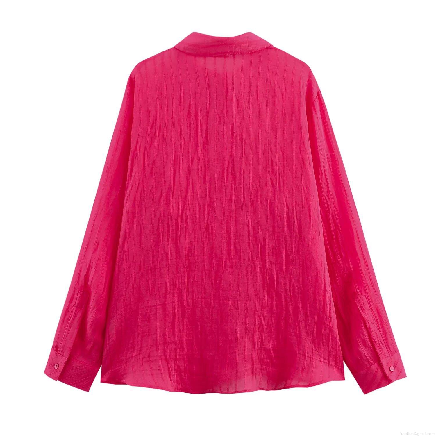 Women Hot Pink Long Sleeve Blouse Pleated Texture Shirt Lapel Single Breasted Button Down Casual Loose Top Lightweight Streetwear Fashion Ladies Clothing