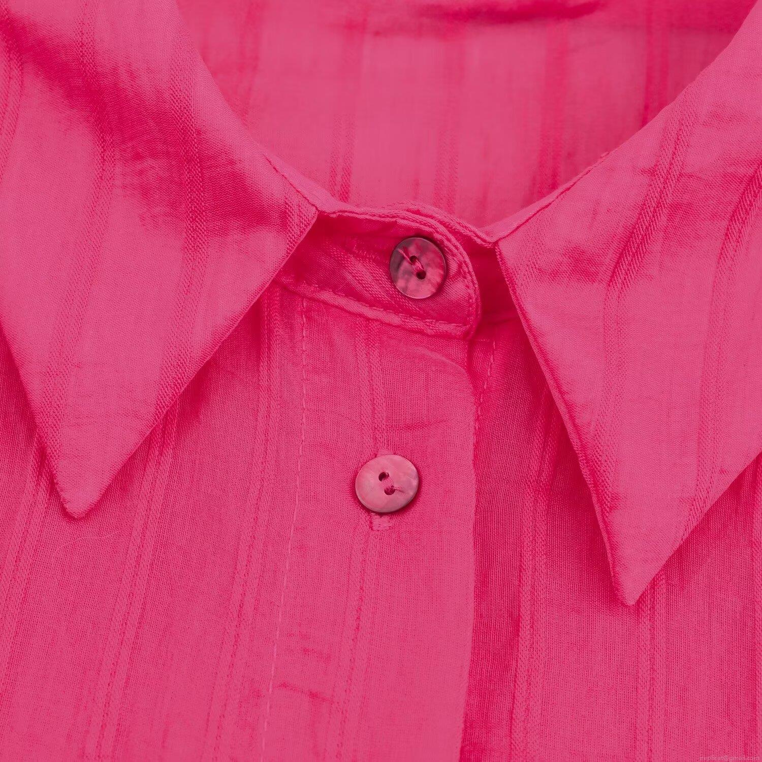 • Women Hot Pink Long Sleeve Blouse Pleated Texture Shirt Lapel Single Breasted Button Down Casual Loose Top Lightweight Streetwear Fashion Ladies Clothing
