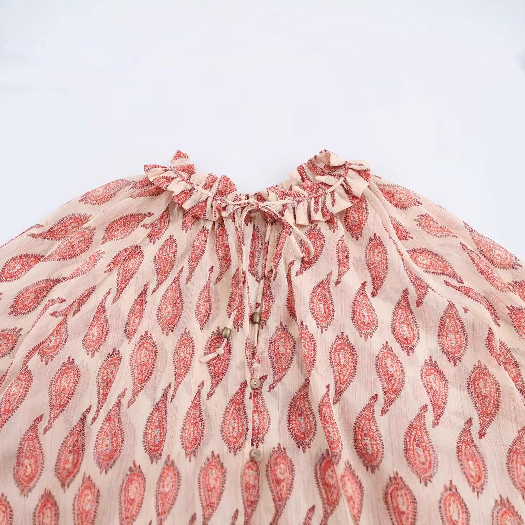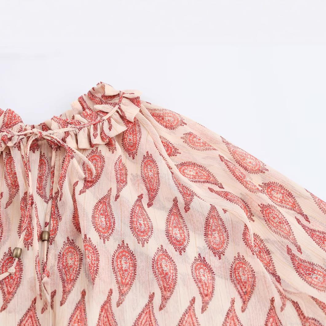 Women Paisley Print Chiffon Blouse Long Bubble Sleeve Ruffle Collar Gold Thread Tie Neck Top Bohemian Streetwear Women Pullover Shirt