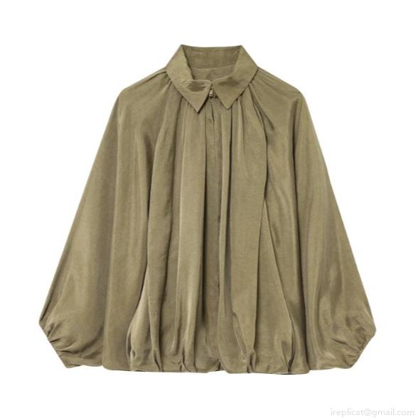 • Women Pleated Long Sleeve Blouse Elegant Zipper Collar Lantern Sleeve Solid Color Satin Texture Shirt For Fashion Lady Casual Top