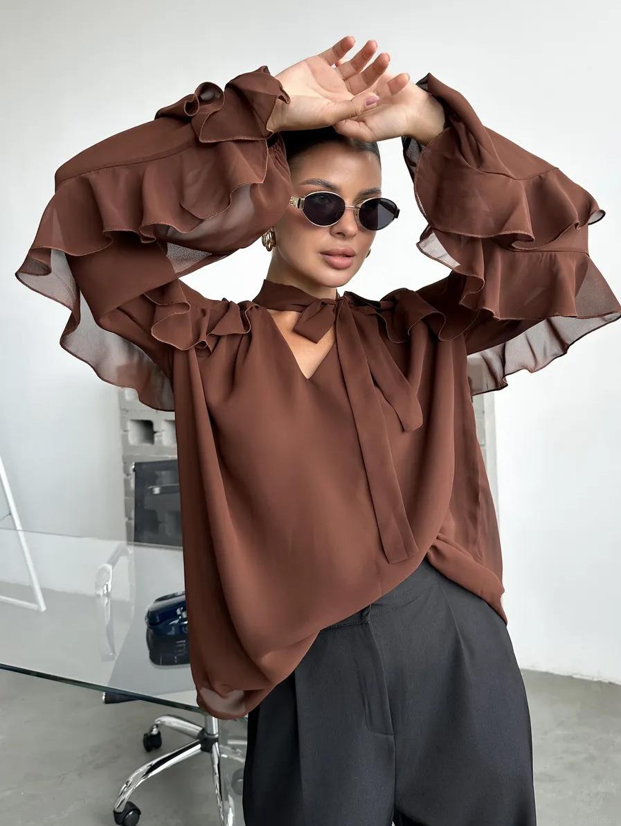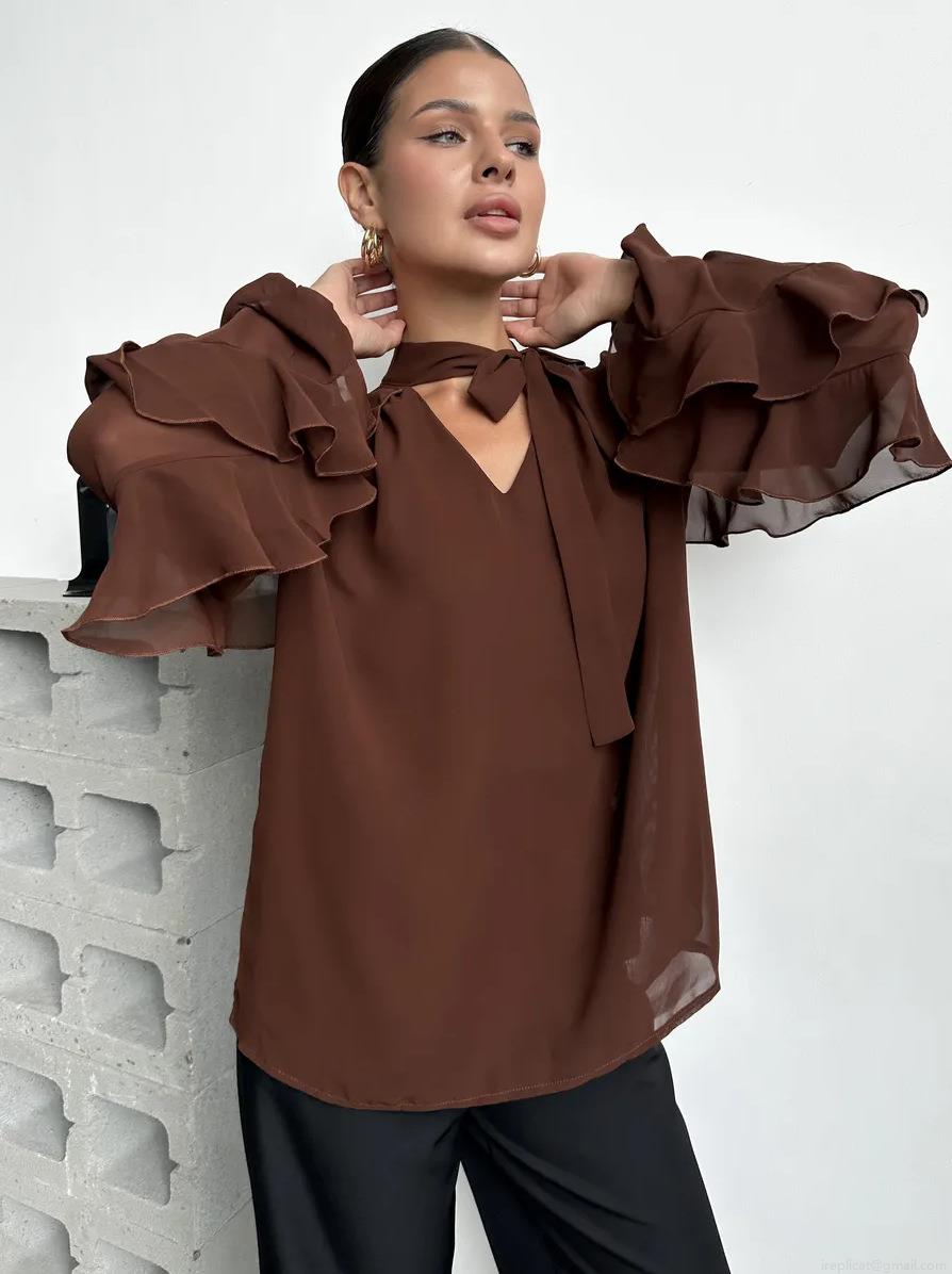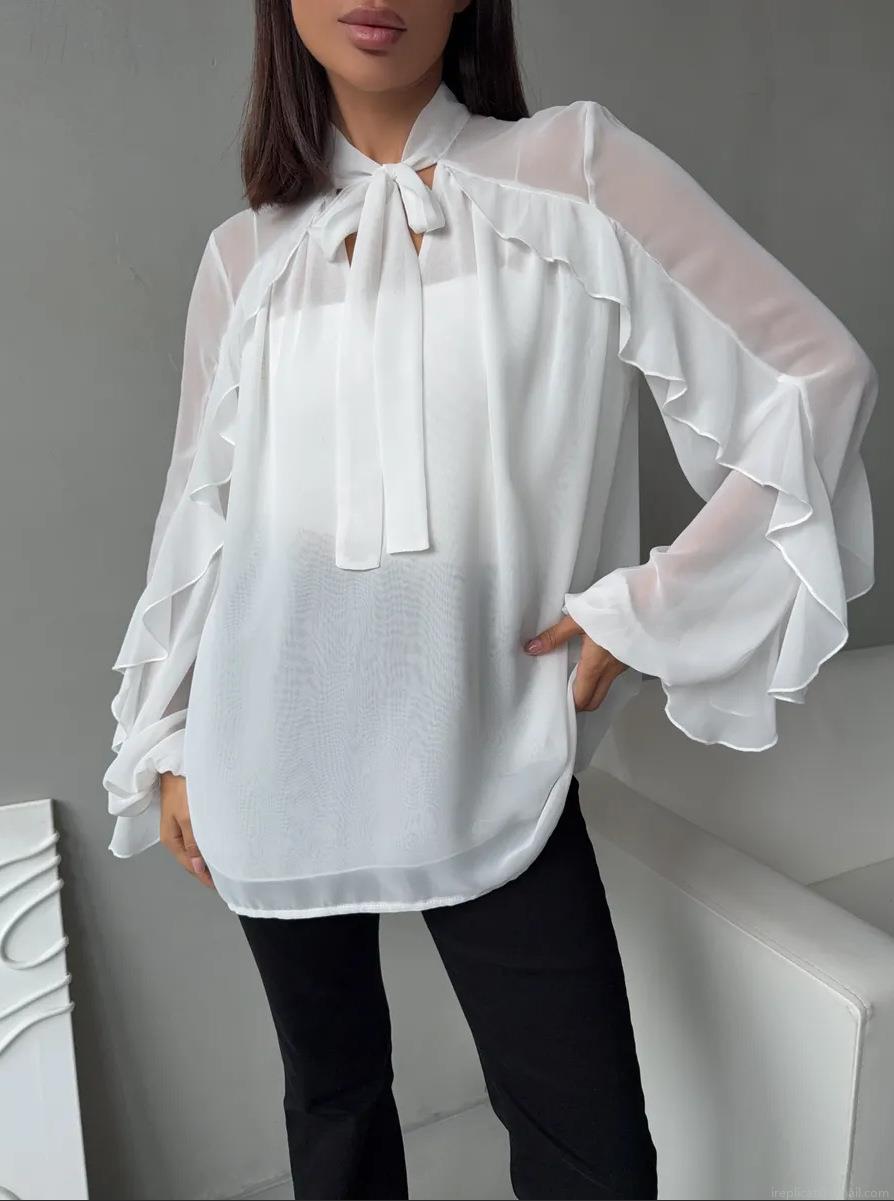 • Women Polyester Chiffon Blouse Ruffle Flared Sleeve Tie Neck Bow Solid Color Elegant Office Work Streetwear Fashion Shirt Top