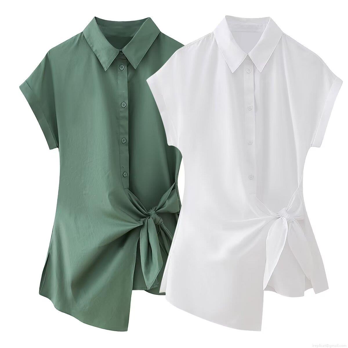 • Women Poplin Short Sleeve Shirt Lapel Button Down Tie Waist Knot Blouse Irregular Hem Solid Color Summer Casual Office Tops Ladies Elegant Commute Fashion Clothing