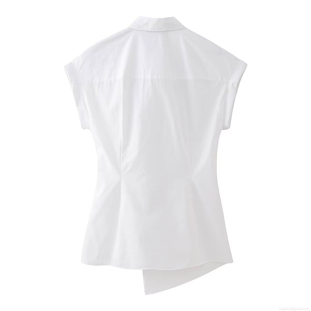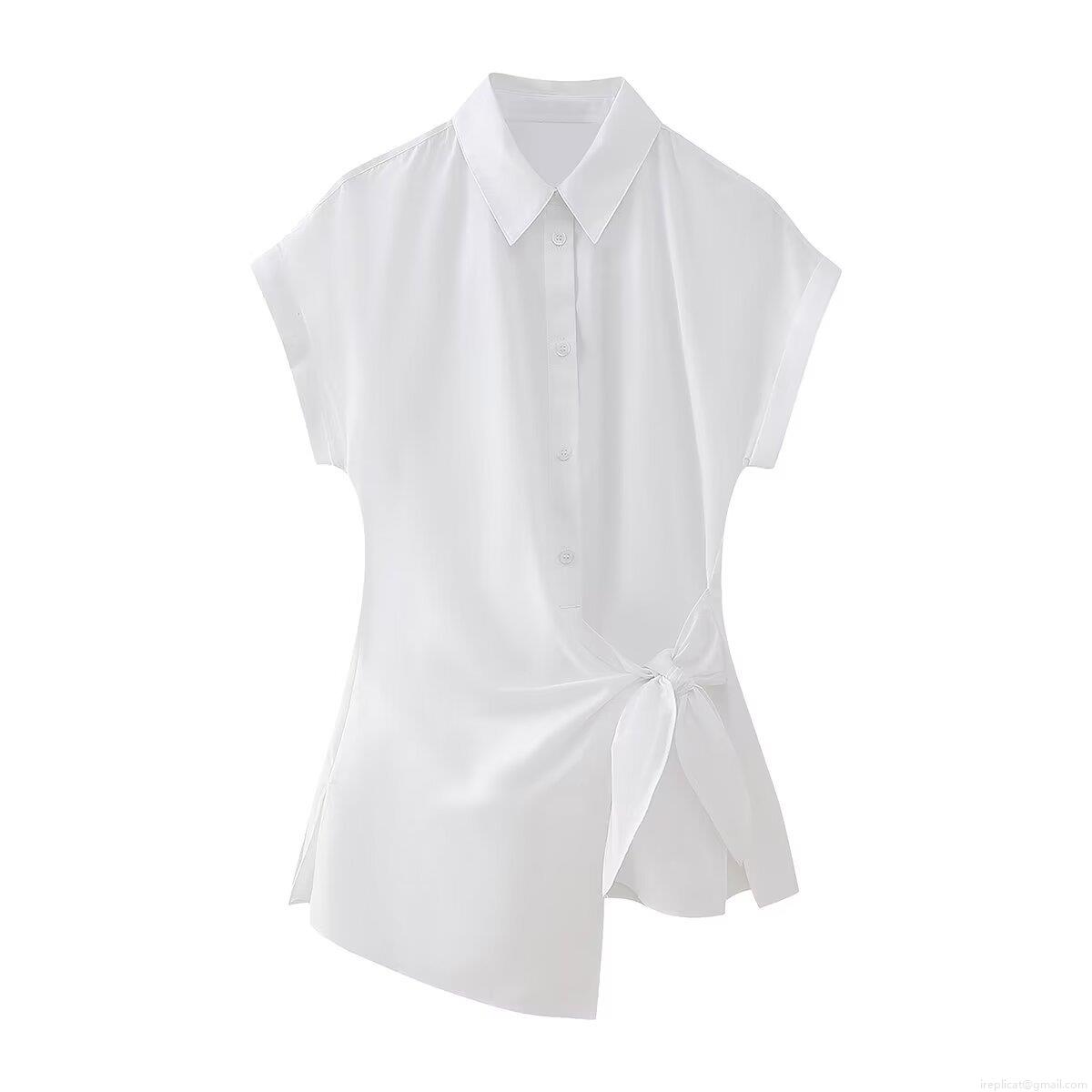 Women Poplin Short Sleeve Shirt Lapel Button Down Tie Waist Knot Blouse Irregular Hem Solid Color Summer Casual Office Tops Ladies Elegant Commute Fashion Clothing