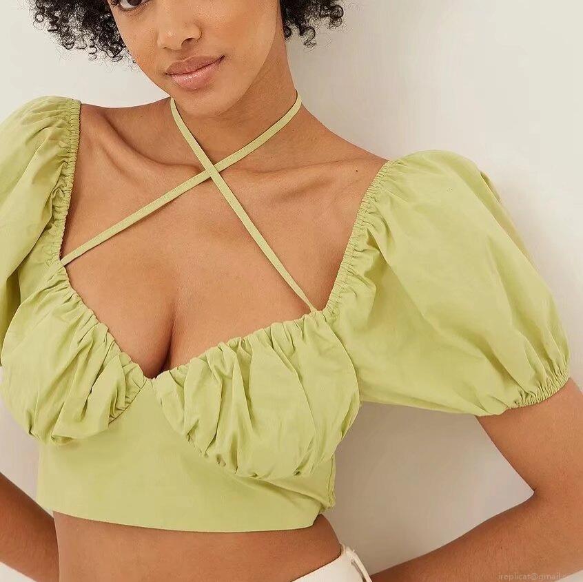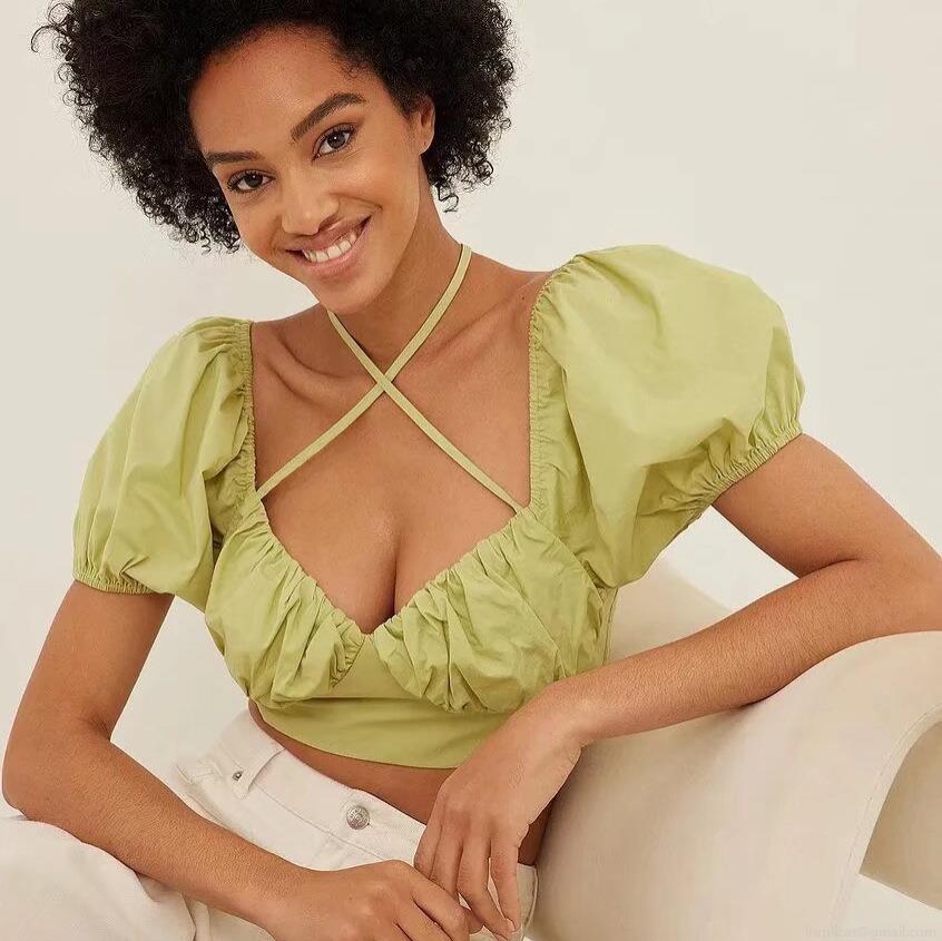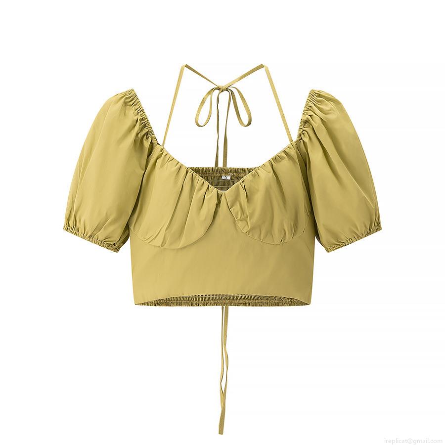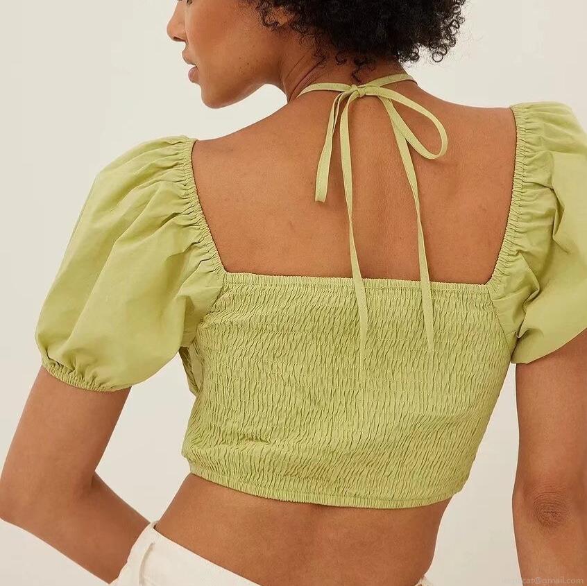 • Women Puff Sleeve Backless Cropped Blouse Ruched Bust Square Neck Tie Back Short Sleeve Sweet Sexy Polyester Top For Summer Spring Casual Daily