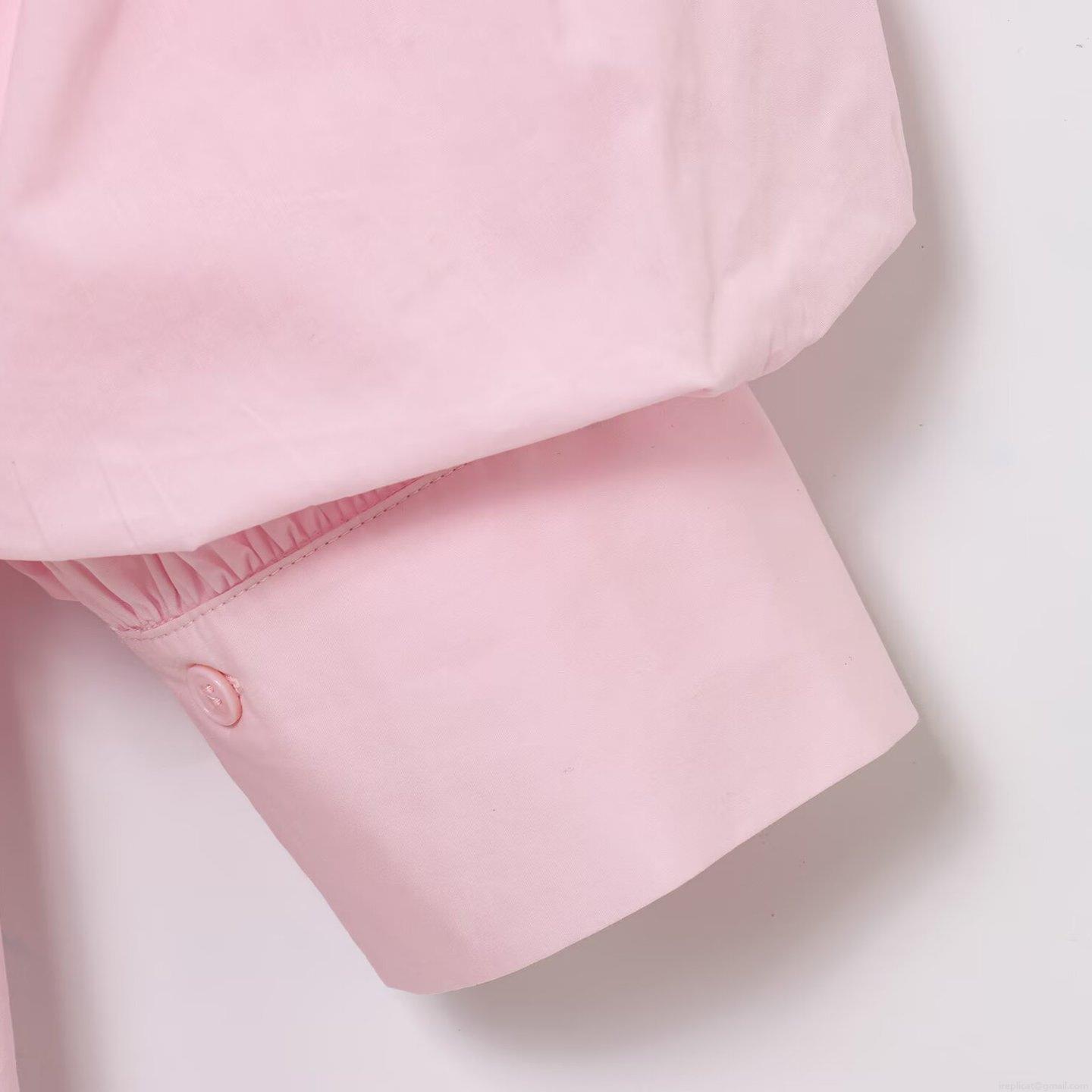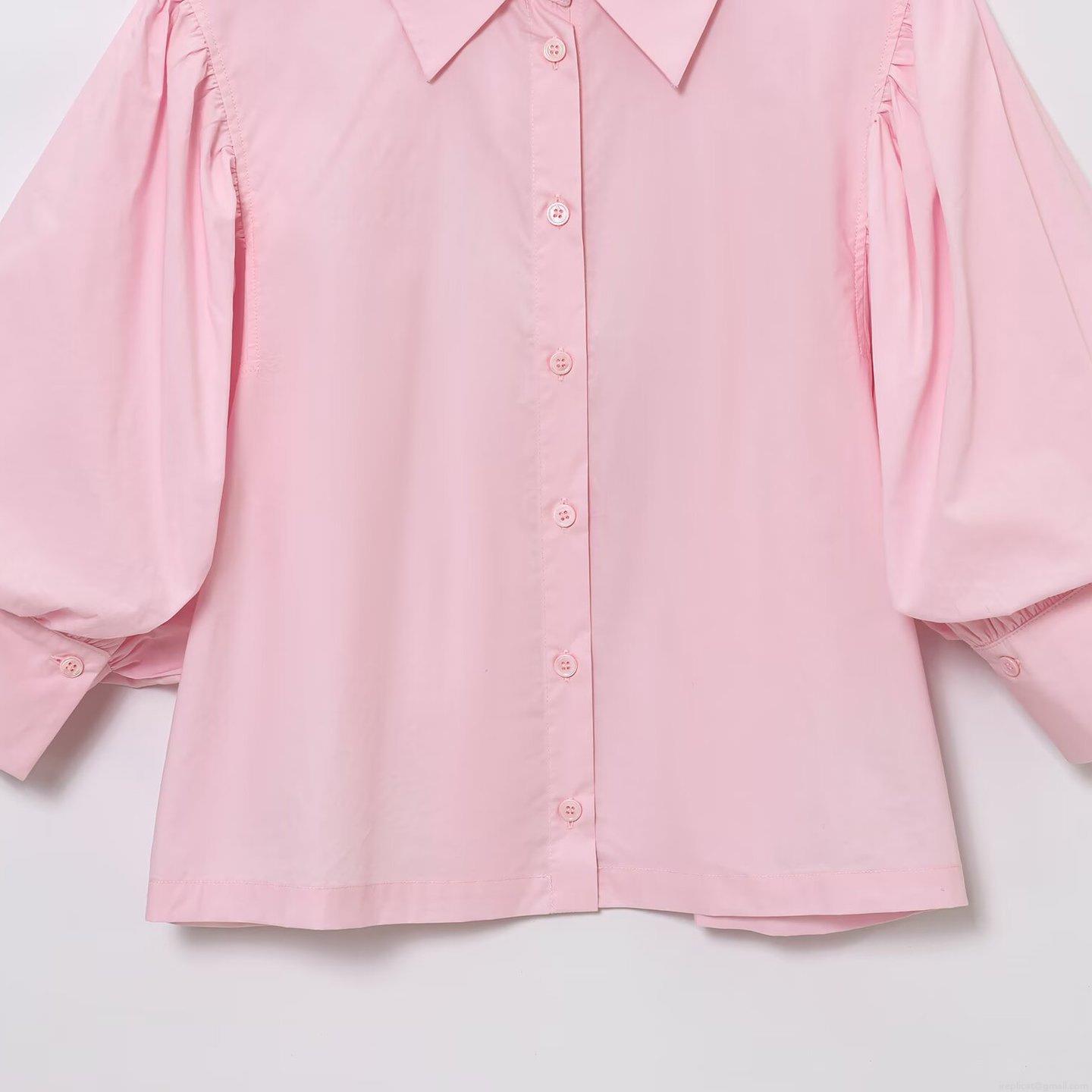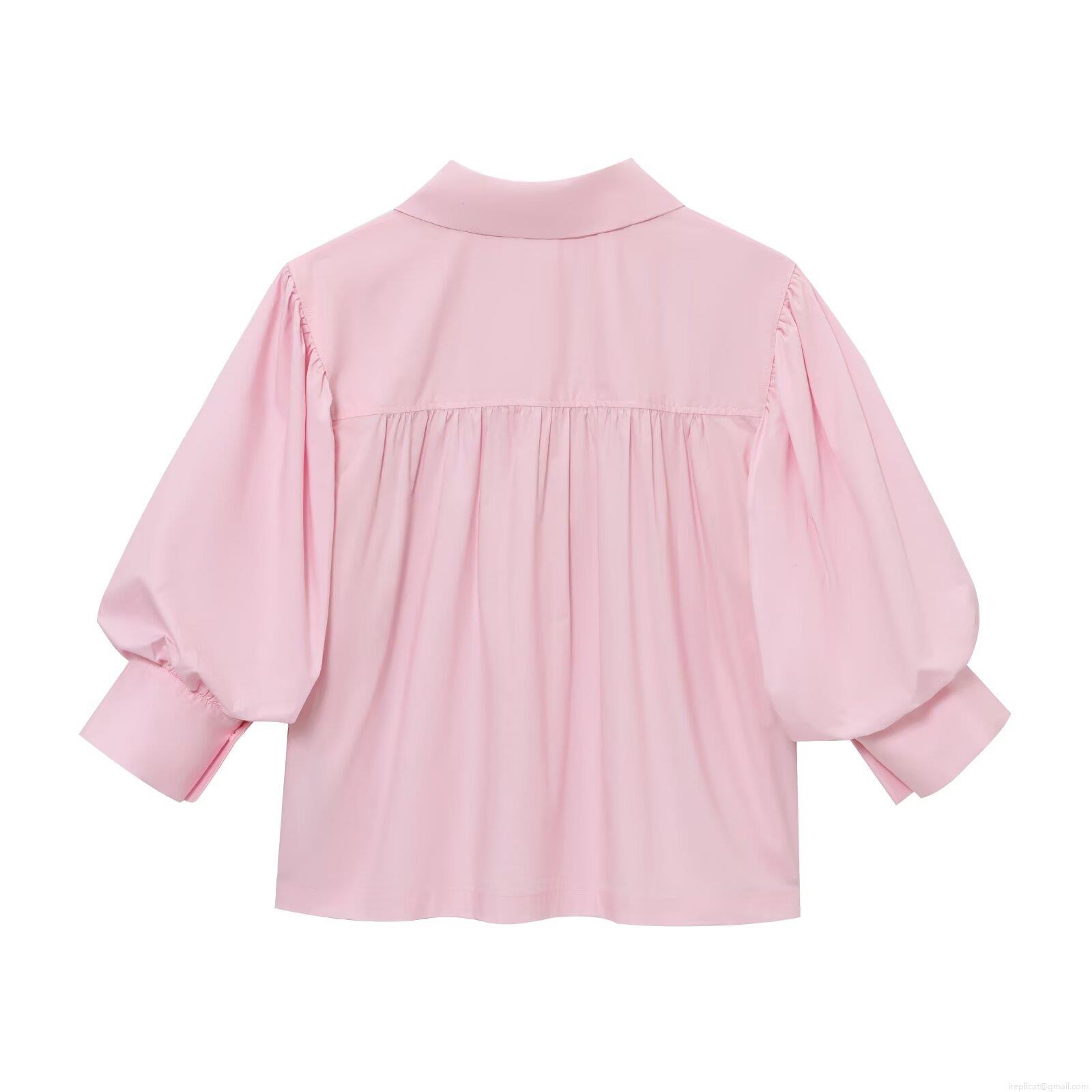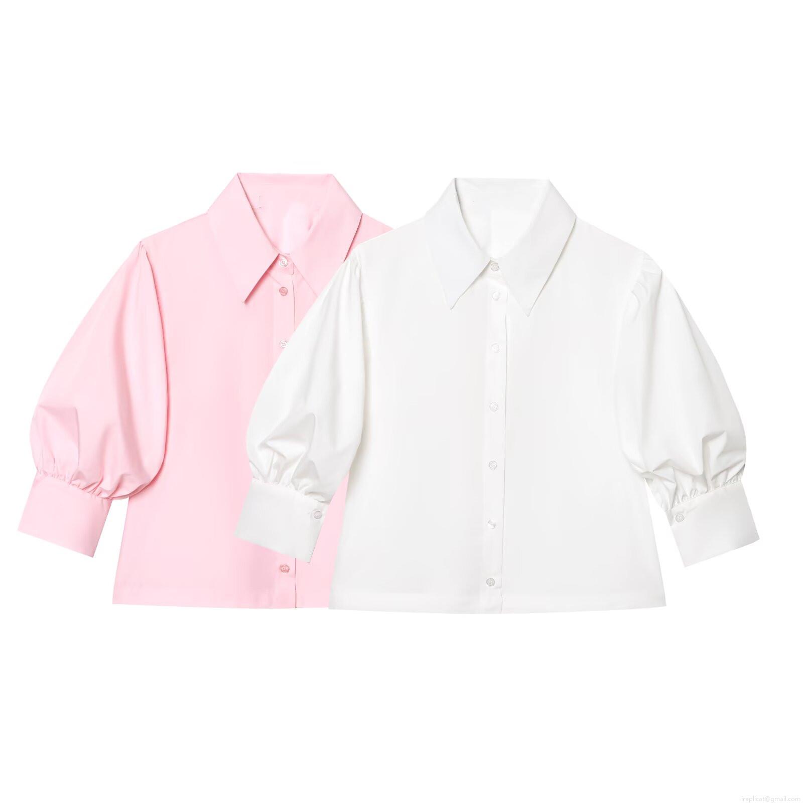 • Women Puff Sleeve Button Down Shirt Polyester Cotton Blend Summer Sweet Minimalist Turn-down Collar Solid Striped Blouse Top Casual Fashion Ladies Clothing