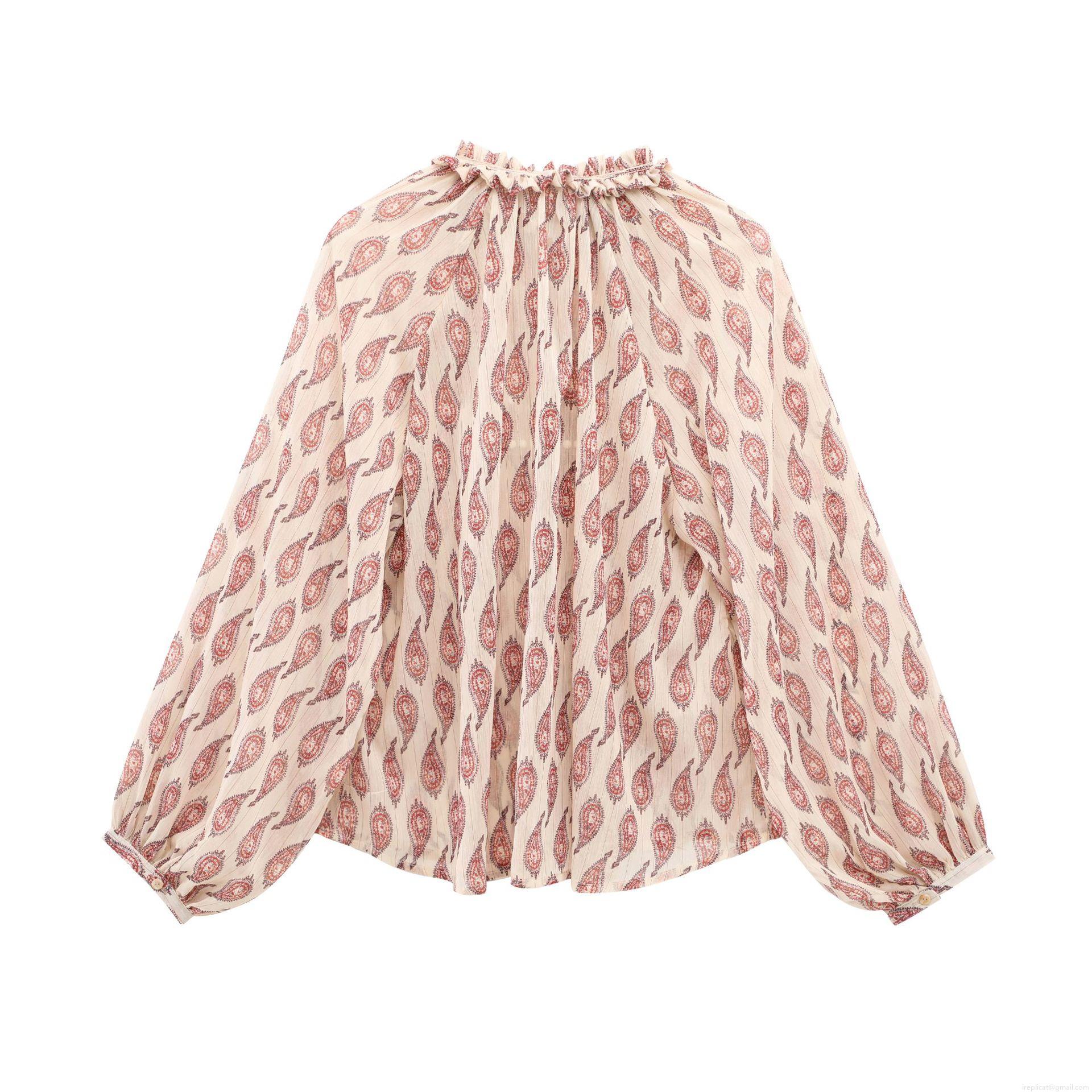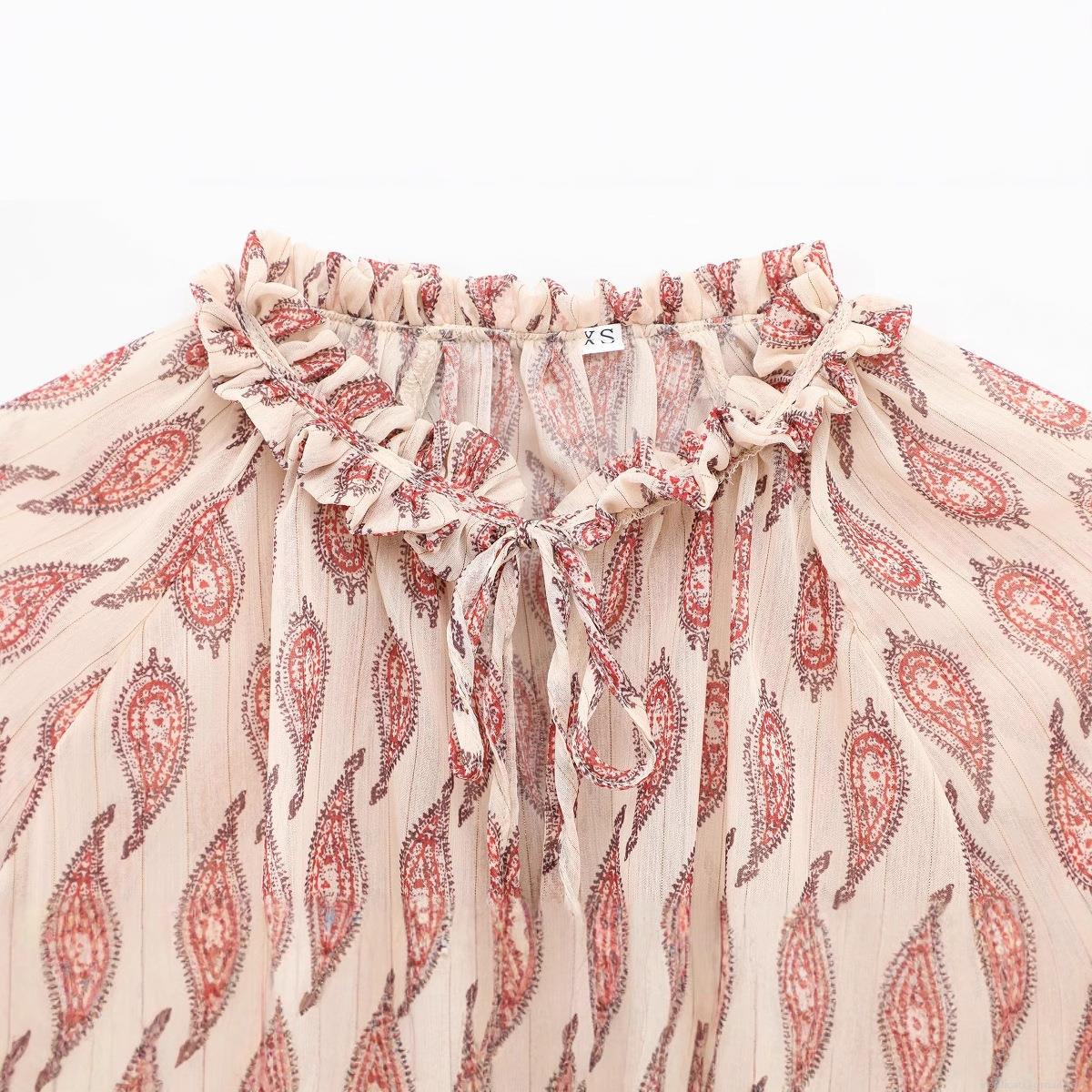 • Women Retro Paisley Print Silver Lurex Chiffon Blouse Ruffle Neck Tie Up Lantern Sleeve Shirt Casual Bohemian Daily Office Tops