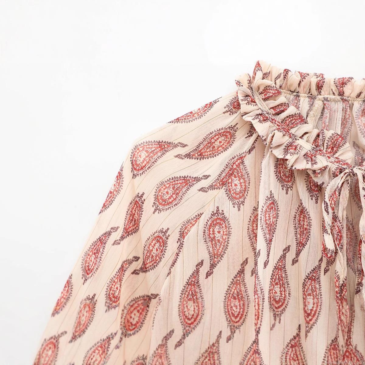 Women Retro Paisley Print Silver Lurex Chiffon Blouse Ruffle Neck Tie Up Lantern Sleeve Shirt Casual Bohemian Daily Office Tops